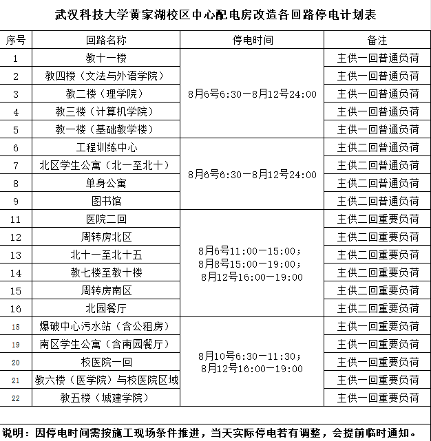 Beat365官网黄家湖校区中心配电房配电柜设备已投入使用近20年,已超设备使用年限。自去年以来故障频发,严重影响学校正常的教学和科研秩序,同时也给广大师生生活带来诸多不便。为确保供电安全,学校拟于暑期对黄家湖中心配电房进行设备更换升级,现根据校园用电实际情况,将近期各区域停电时间通知如下: