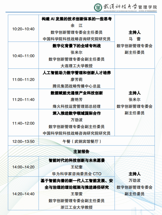 会议安排大会主旨报告、分论坛报告和专委会会员活动,围绕实体经济与数字经济深度融合、人工智能对数字创新管理的影响、人工智能与创新生态系统构建、人工智能与新质生产力的融合创新、新质生产力视角下的创新管理策略、数据驱动的创新管理策略等主题展开。