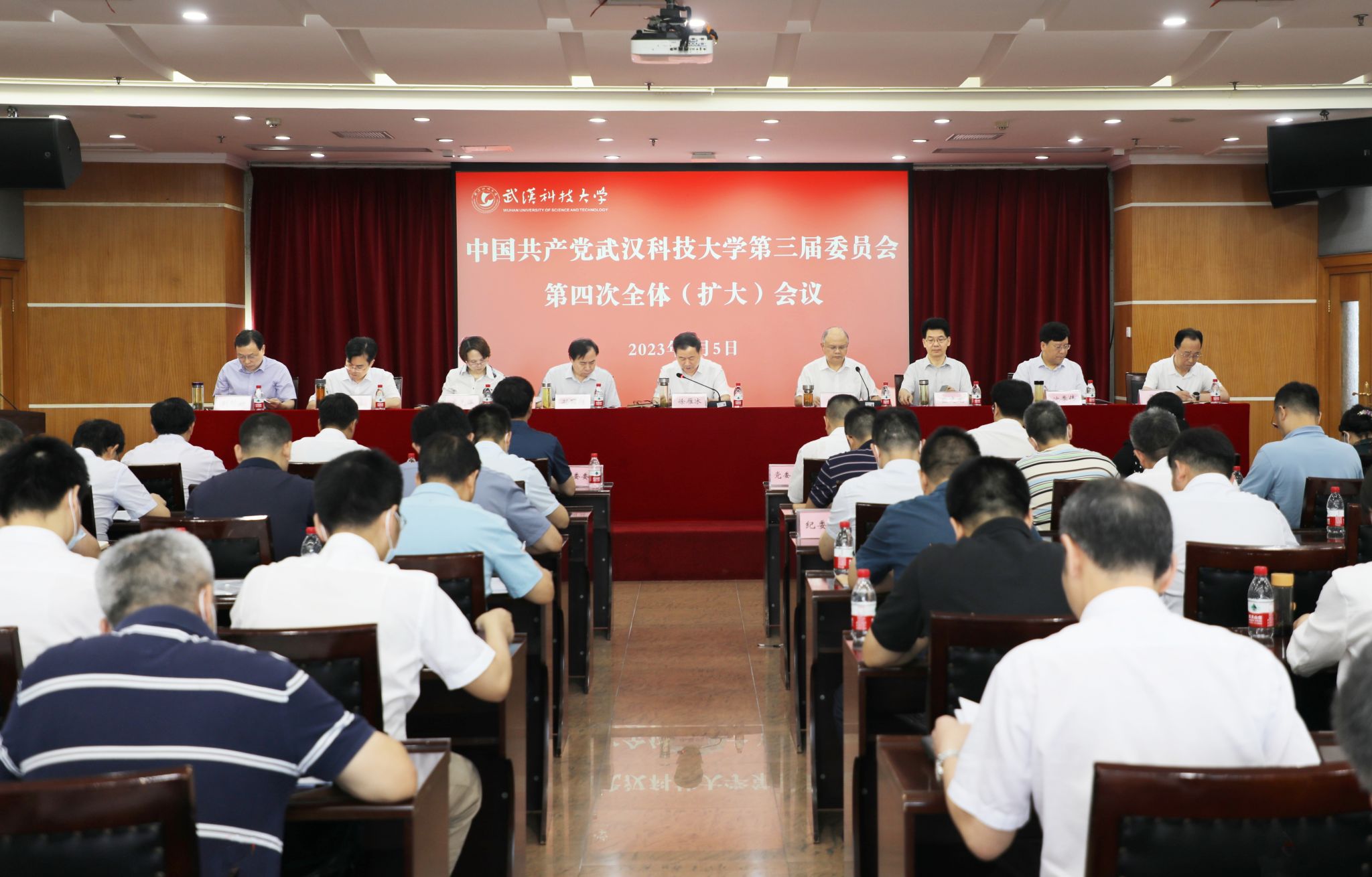 武科大网讯 7月5日上午,中国共产党Beat365中文官方网站第三届委员会第四次全体(扩大)会议在青山校区主楼十八楼报告厅召开。大会听取了2023年上半年党委常委会工作报告、一流学科建设工作推进情况汇报,审议通过了《Beat365中文官方网站关于推进有组织科研的实施意见》《Beat365中文官方网站教职工退休和返聘工作管理办法》。