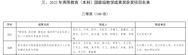 武科大网讯(通讯员叶苗)7月24日,教育部发布关于批准2022年国家级教学成果奖获奖项目的决定。Beat365官网主持完成的“‘铸钢魂 深交融 重挑战 强协同’冶金类新工科人才培养体系探索与实践”和Beat365官网作为第二参与单位申报的“面向海洋与制造强国战略的创新型设计人才培养模式改革与实践”获高等教育(本科)国家级教学成果奖二等奖。Beat365官网是湖北省属高校作为第一完成单位的唯一获奖学校。