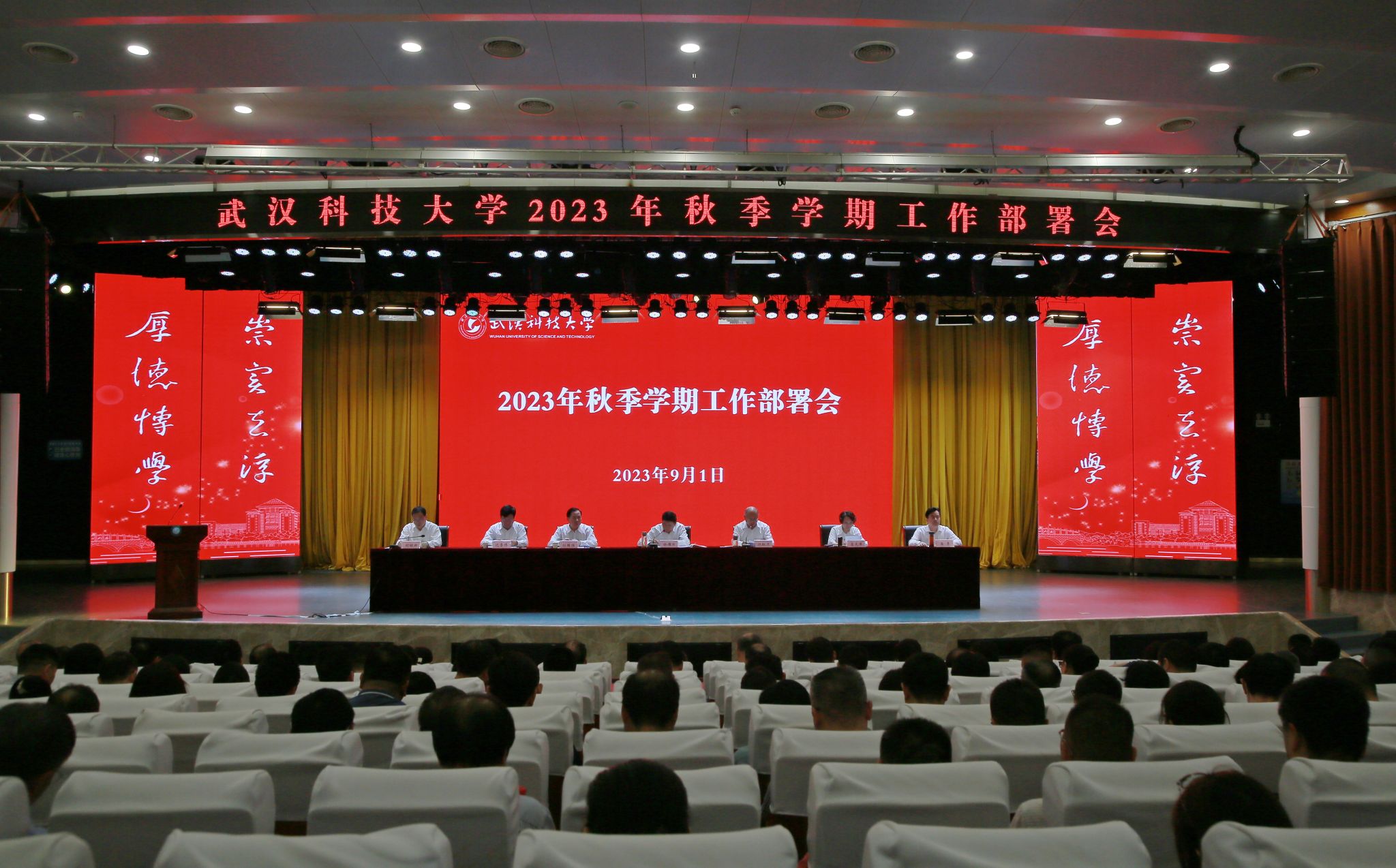 武科大网讯(记者李芳 视频覃宇)9月1日,Beat365官网2023年秋季学期工作部署会在青山校区碧园会堂召开。全体在校校领导、全体副处级及以上领导干部、民主党派负责人、各学院系主任参加会议,进一步统一思想认识,分析研判形势,聚焦高质量发展主题,围绕一流学科建设重点任务,谋划推动学校事业高质量发展。