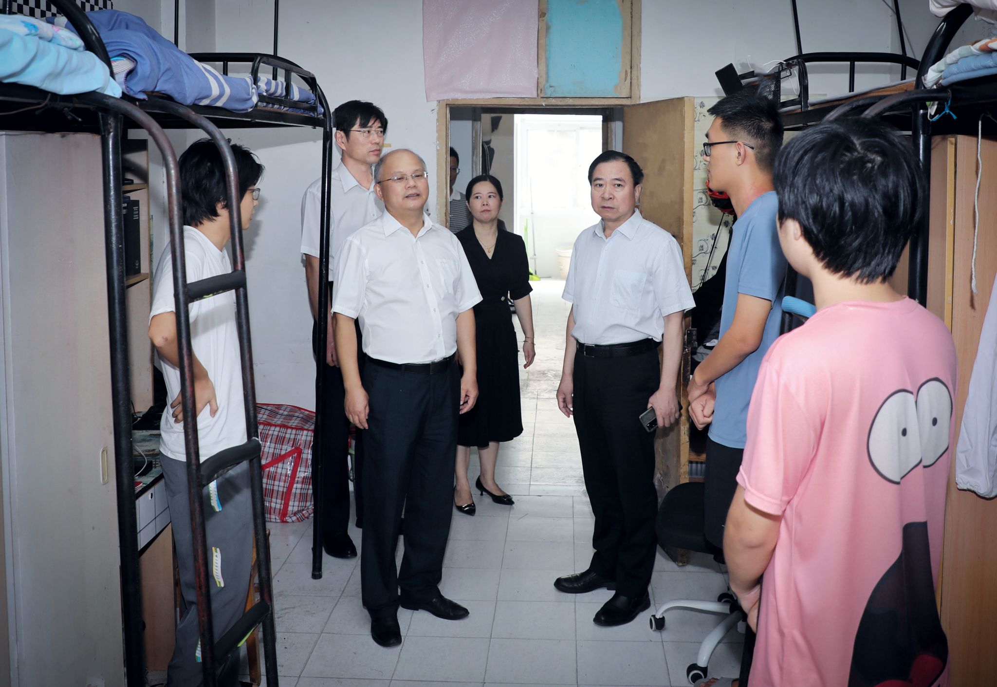 校领导一行先后来到青山校区西院小树林广场、室外运动场、人行天桥建设项目、春华餐厅、人和学生公寓,详细了解各单位暑期工作的开展情况和开学准备工作的筹备事宜,就校园环境改造、教学条件保障、生活后勤保障、校园安全保卫、食品卫生安全等情况进行检查,并看望了从黄家湖校区搬迁至青山校区的学生。