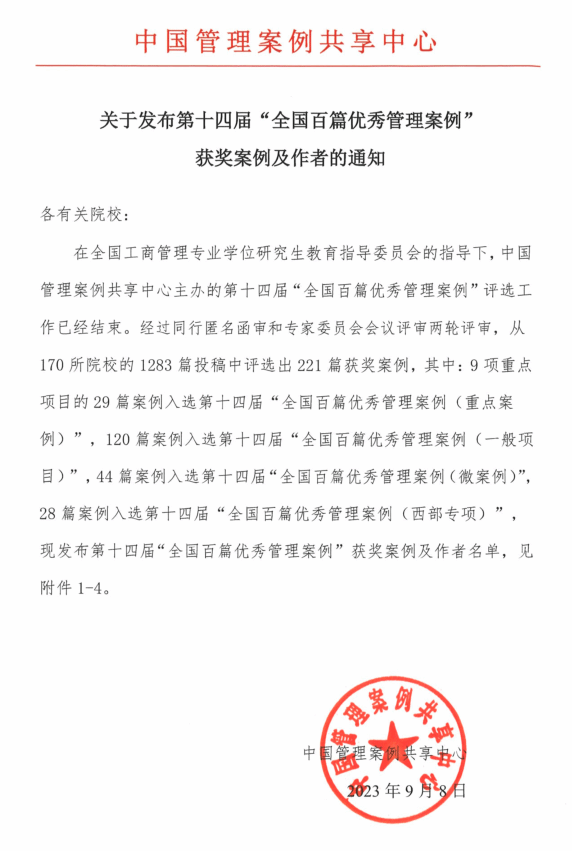 本届评选于3月30日启动,共收到来自全国170所院校的1283篇投稿。通过专家匿名函评和专家会议评审两个环节,最终确定9所院校的9个项目29篇案例入选第十四届全国百篇优秀管理案例(重点案例),68所院校的120篇案例入选第十四届全国百篇优秀管理案例(一般项目),31所院校的44篇案例入选第十四届全国百篇优秀管理案例(微案例),13所院校的28篇案例入选第十四届全国百篇优秀管理案例(西部专项)。