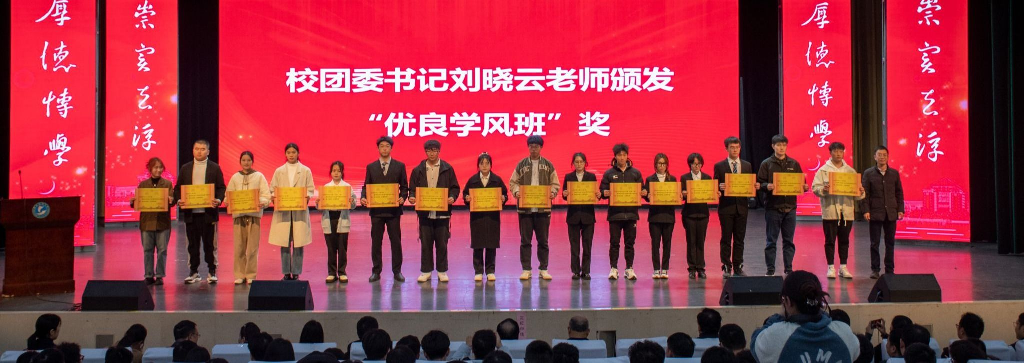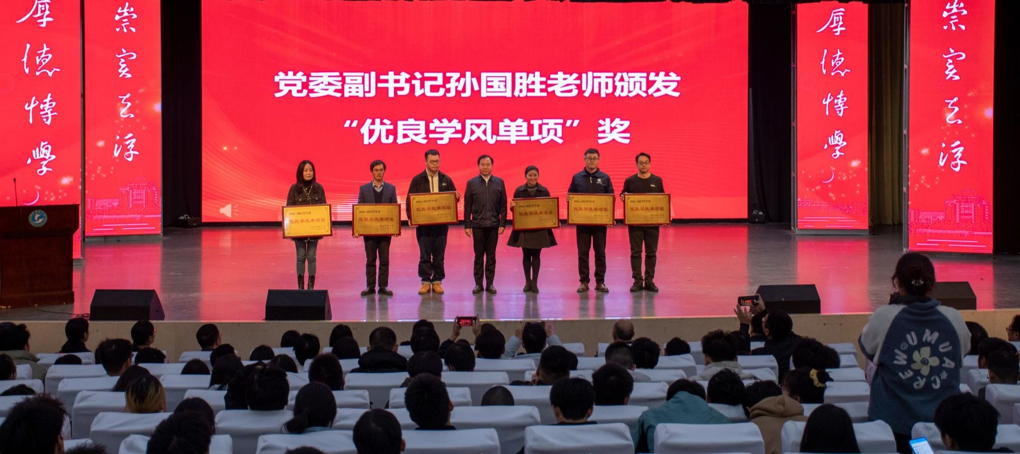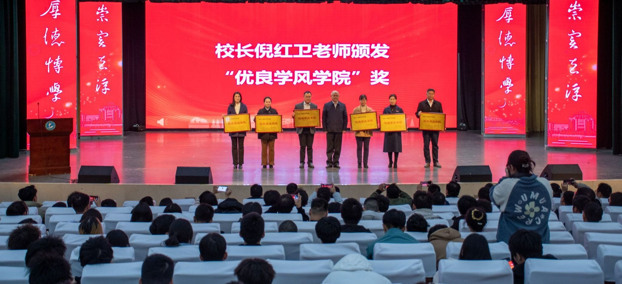 会上,倪红卫为“优良学风学院”颁奖,孙国胜颁发“优良学风单项”奖,刘晓云颁发“优良学风班”奖。