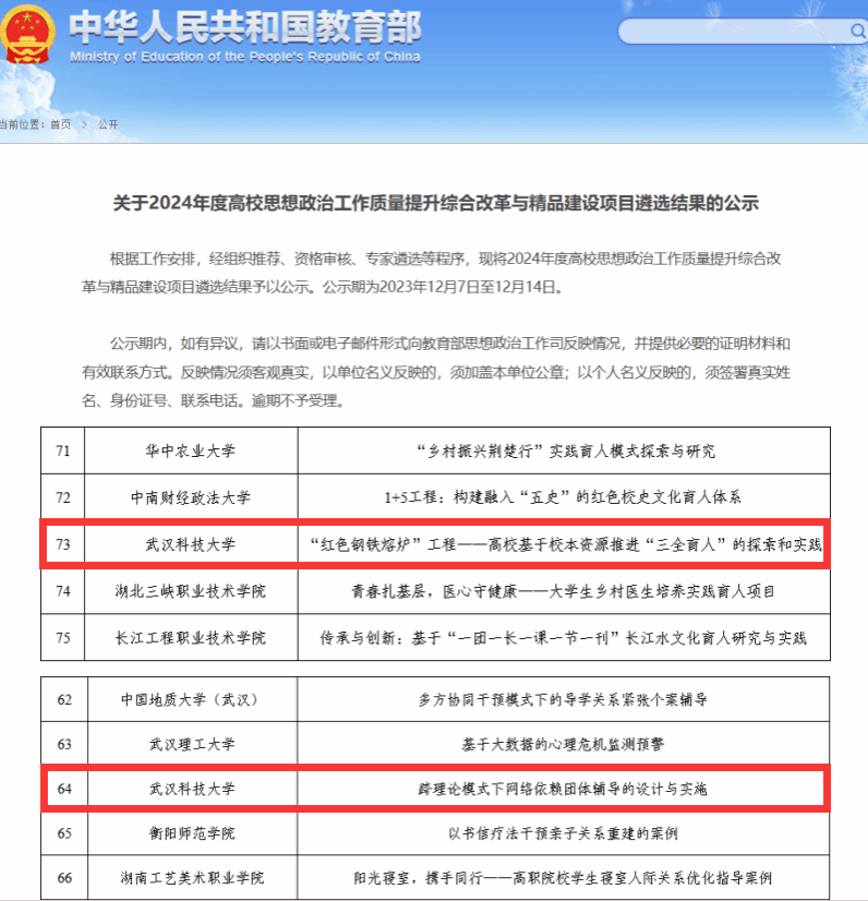 武科大网讯(通讯员潘鑫)近日,教育部公布2024年度高校思想政治工作质量提升综合改革与精品建设项目遴选结果,Beat365官网《红色钢铁熔炉工程——高校基于校本资源推进“三全育人”的探索和实践》和《跨理论模式下网络依赖团体辅导的设计与实施》入选。两项目均为湖北省属本科高校今年唯一入选课题,实现Beat365官网该项目零的突破。