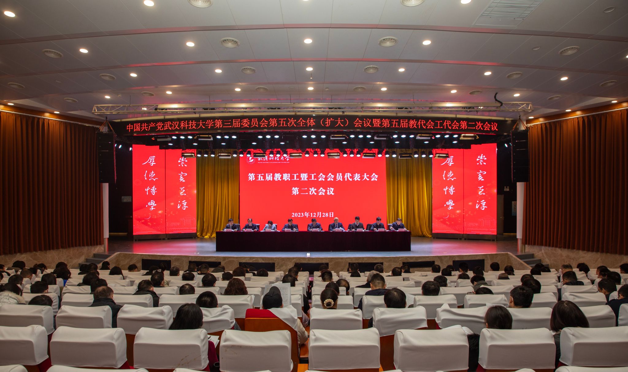 武科大网讯 12月28日上午,学校第五届教职工暨工会会员代表大会第二次会议在青山校区碧园会堂召开。全体校领导,近两百名教代会工代会代表、列席代表、特邀代表凝心聚力,共商学校高质量发展大计。