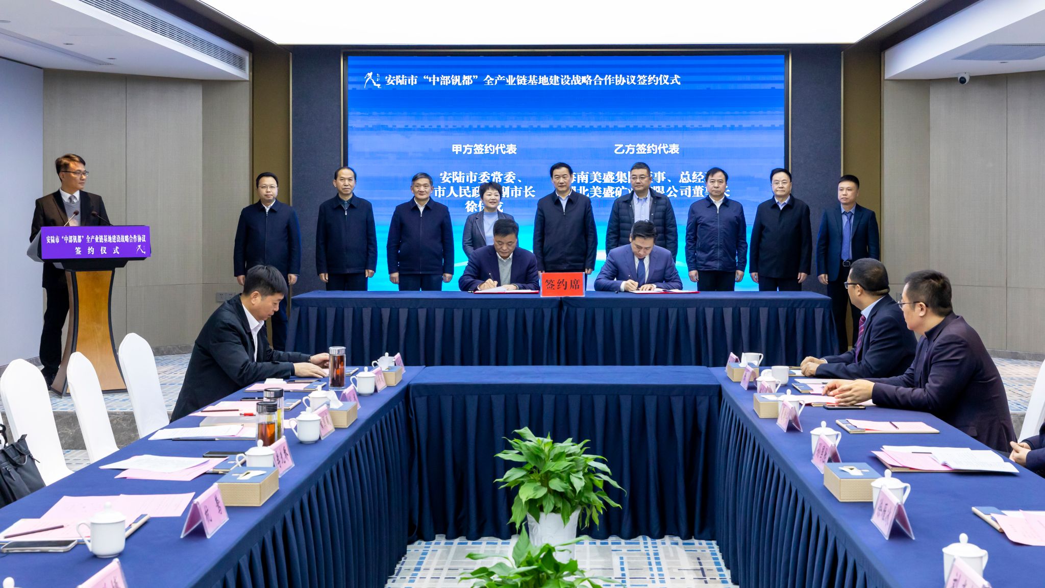 海南美盛集团董事长陈农作为企业代表致辞。安陆市委常委、副市长徐保成与海南美盛集团董事总经理、湖北美盛矿业有限公司董事长林栋,湖北工建集团党委委员、常务副总经理陈常青,大力储能技术湖北有限责任公司董事总经理史小虎,安陆市浩源国投有限公司总经理余新伟共同签署了《战略合作框架协议》。