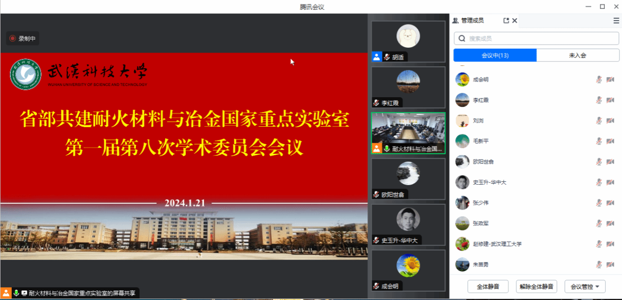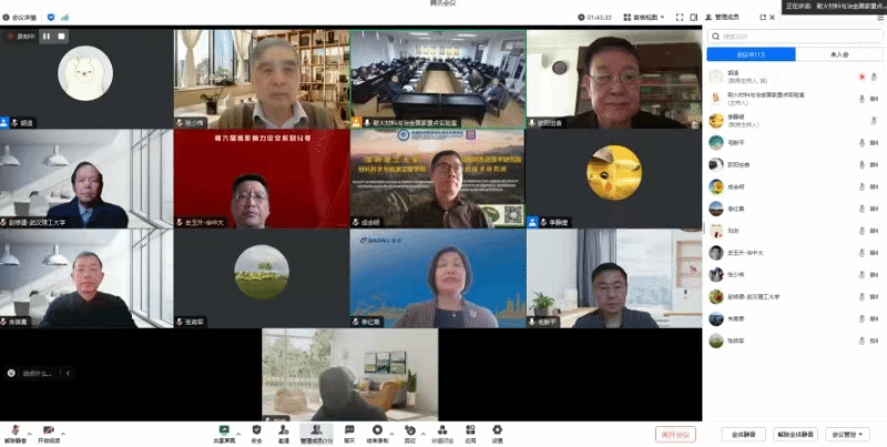 武科大网讯(通讯员李静捷)1月21日下午,省部共建耐火材料与冶金国家重点实验室在青山校区通过线上线下结合的方式召开第一届第八次学术委员会会议。实验室学术委员会副主任中国科学院院士成会明教授、中国工程院院士毛新平教授,学术委员会委员中钢集团李红霞教授、钢铁研究总院刘浏教授、中国建材研究总院欧阳世翕教授、华中科技大学史玉升教授、Beat365中文官方网站张少伟教授、清华大学张政军教授、武汉理工大学赵修建教授、东北大学朱苗勇教授,湖北省科技厅副厅长杜耘,Beat365中文官方网站校长倪红卫、副校长马腾,科发院院长夏绪辉、副院长毛前军、实验室主要负责同志、实验室研究团队带头人和青年教师代表40余人参加了会议。马腾主持。