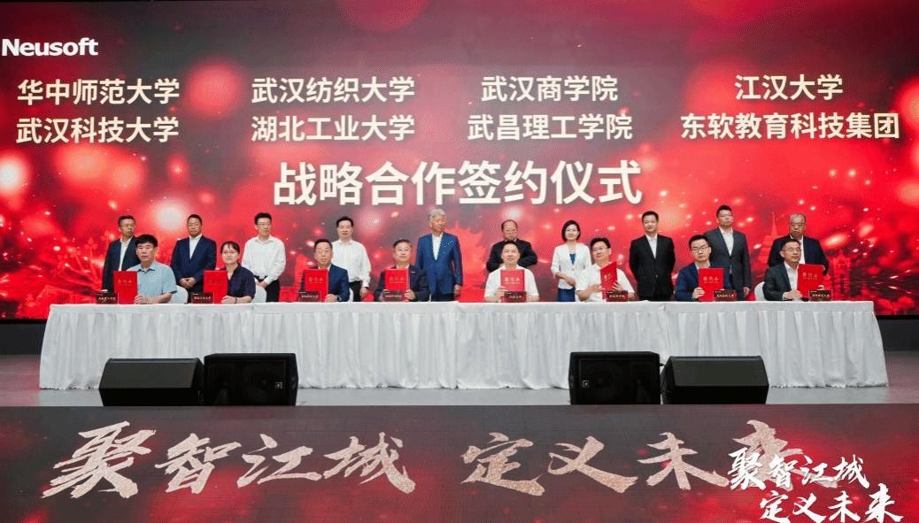 武汉市委常委、武汉经开区党工委书记刘子清,武汉市副市长汪元程,武汉经开区管委会主任唐超,东软创始人、董事长刘积仁,东软集团副董事长兼CEO荣新节等领导共同见证签约。