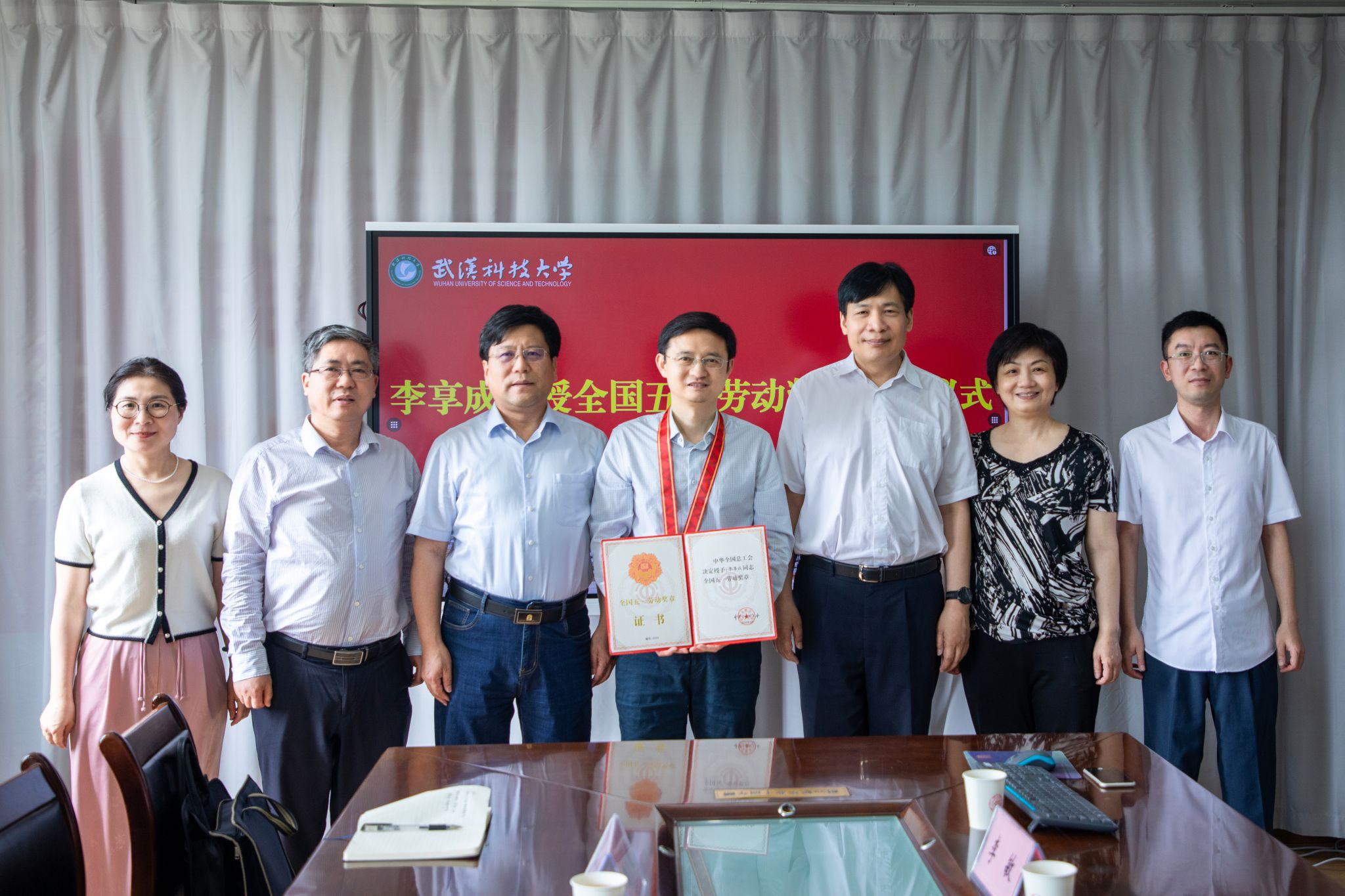 武科大网讯 6月3日,省教科文卫体工会主席熊晓泉一行来校看望慰问2024年“全国五一劳动奖章”获得者李享成教授,并为李享成颁发全国五一劳动奖章和荣誉证书。副校长沈季伟、校工会常务副主席李敏,材料学部执行主任顾华志,材料学部党委书记刘晓云等领导参加慰问活动。