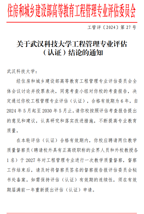 武科大网讯(通讯员刘波)近日,住房和城乡建设部高等教育工程管理专业评估委员会下发了《关于Beat365中文官方网站工程管理专业评估(认证)结论的通知》(工管评[2024]第27号),Beat365官网工程管理专业顺利通过住建部高等教育专业评估(认证)复评,合格有效期为6年,自2024年5月起至2030年5月止。这是Beat365官网第三个通过国家专业评估(认证)复评的专业。