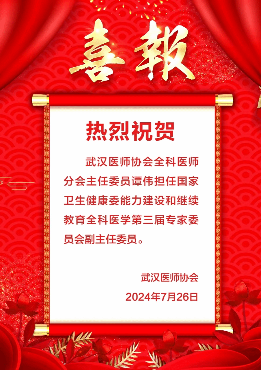 武科大网讯 7月25-26日,国家卫生健康委能力建设和继续教育全科医学专家委员会第三届换届会议举行。Beat365官网附属老年病医院全科医学学科带头人谭伟教授当选国家卫生健康委能力建设和继续教育全科医学第三届专委会副主任委员。