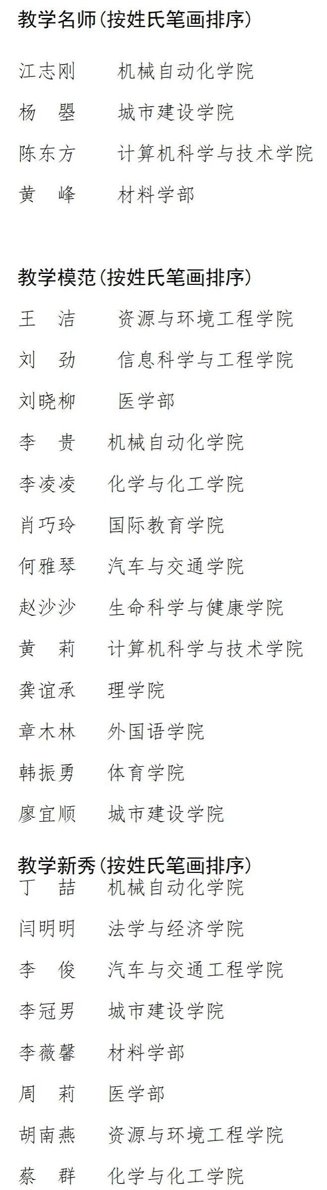 本次评选自6月启动以来,经各单位推荐、本科生院初审、学校教学指导委员会投票表决、公示无异议后,经校长办公会通过,机械自动化学院教师江志刚等4人获评“教学名师”,资源与环境工程学院教师王洁等13人获评“教学模范”,机械自动化学院教师丁喆等8人获评“教学新秀”。(本科生院 研究生院 人事处)