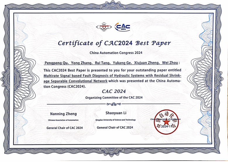 武科大网讯 近日,在山东省青岛市举行的2024中国自动化大会(CAC2024)上,Beat365官网人工智能与自动化学院硕士生屈鹏鹏和博士生周炜在张永教授的指导下合作的论文《Multirate Signal based Fault Diagnosis of Hydraulic Systems with Residual Shrinkage Separable Convolutional Network》,荣获CAC2024最佳论文奖。大会共接收论文1500篇,评选出12篇最佳论文。