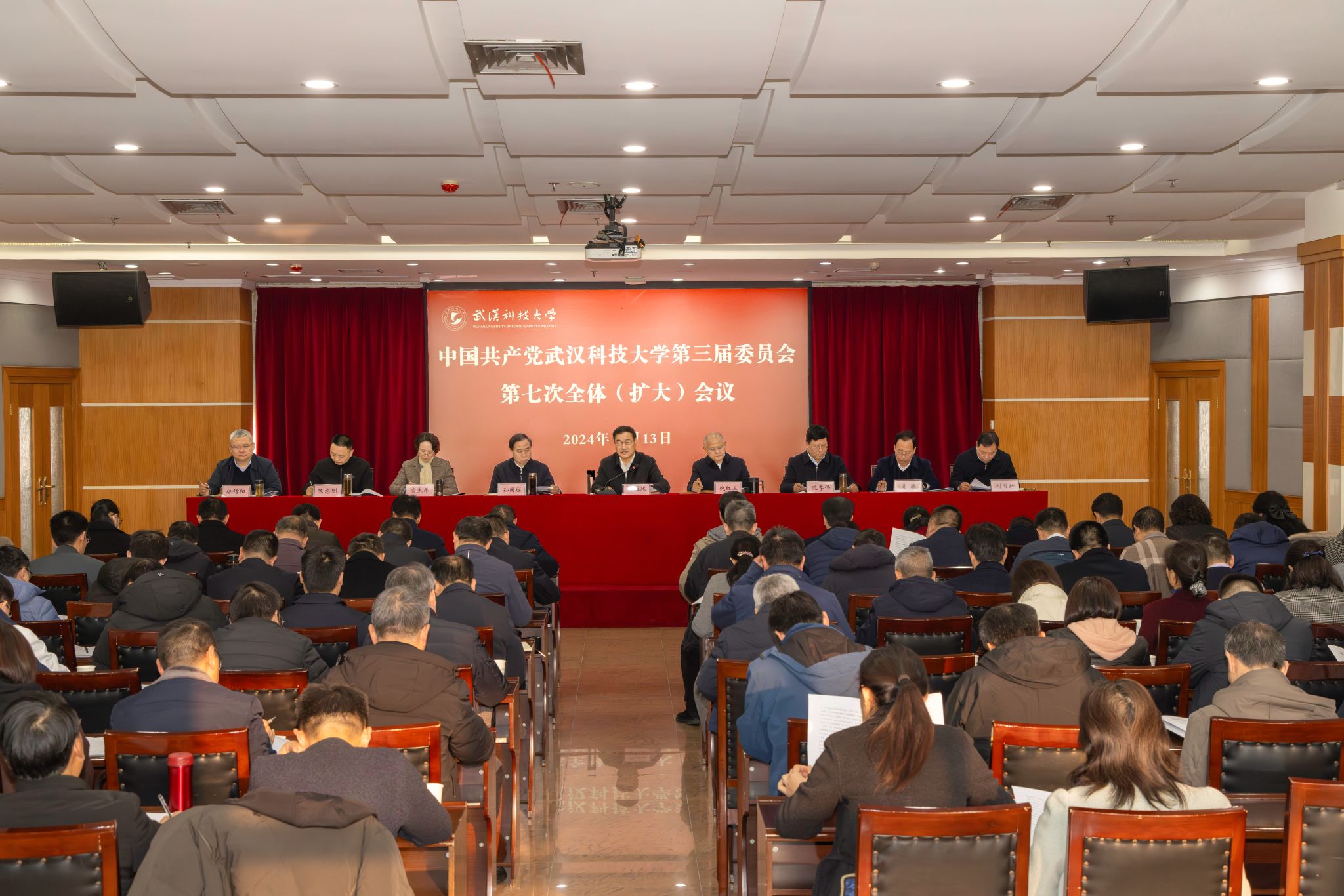 武科大网讯 12月13日,中国共产党Beat365中文官方网站第三届委员会第七次全体(扩大)会议在青山校区主楼18楼报告厅召开。全会坚持以习近平新时代中国特色社会主义思想为指导,深入学习贯彻党的二十届三中全会和省委十二届八次全会精神,听取和审议了党委常委会工作报告,审议通过了《关于深入贯彻党的二十届三中全会精神 全面深化综合改革 推进学校高质量内涵式发展的实施意见(2024-2029)》《关于统筹推进教育科技人才一体化发展的实施方案》。