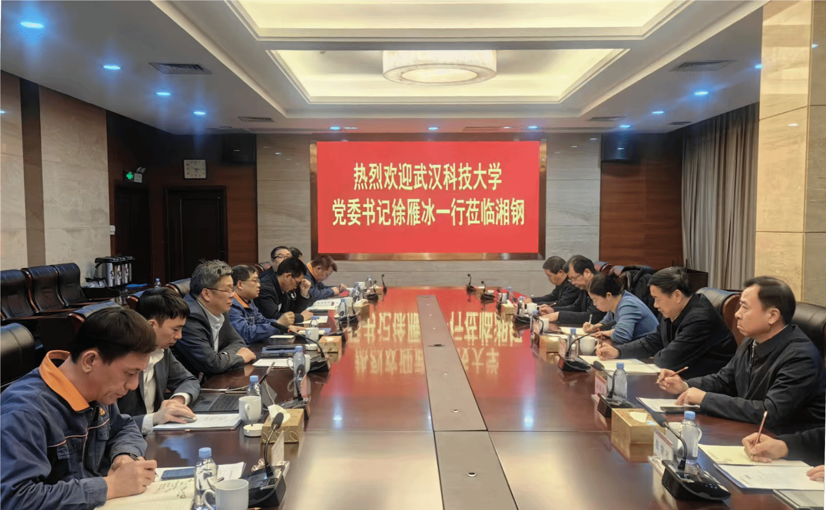 徐雁冰称赞湖南钢铁集团是地方钢铁企业的旗帜和标杆,在坚持加快发展新质生产力,深化体制机制改革,推动企业高端化、智能化、绿色化转型升级等方面成果丰硕,企业绩效激励政策、国际化改革发展等成功经验值得学习借鉴。徐雁冰指出,近年来,学校围绕“一主两翼三新”学科发展布局,在一流学科建设、高层次人才引育、科技创新、人才培养等方面取得长足发展,特别是学校作为湖北省首批卓越工程师学院建设高校,坚持以产教融合为牵引,积极推进研究生培养模式创新,为校企合作人才培养方面探索了新路径。徐雁冰表示,希望双方在重大科研项目合作、卓越工程师培养模式创新等领域进一步深化交流合作,实现互利共赢,共同助力学校一流学科建设和双方高质量发展。