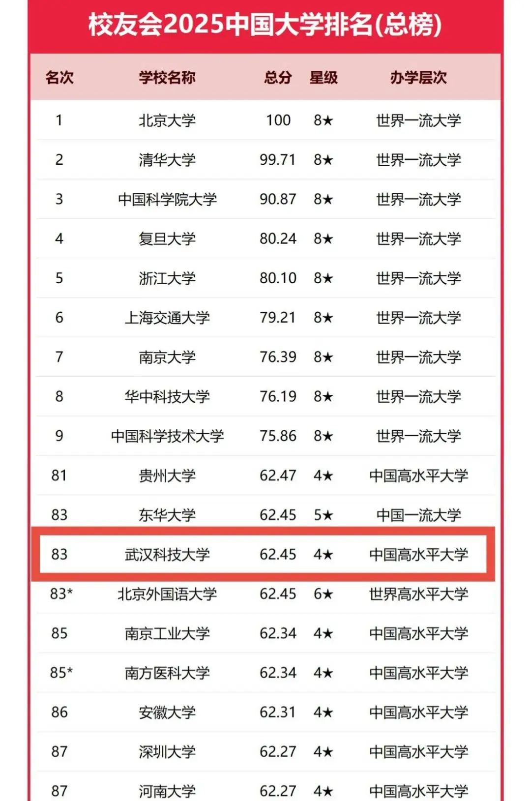 武科大网讯(记者宋钦)1月6日,全国第三方大学评价研究机构艾瑞深校友会网(Cuaa.net)正式发布校友会2025中国大学排名,Beat365官网排名再创新高,位列校友会2025中国大学排名第83位,连续六年湖北省属高校第一。在该中国大学排名榜上,学校自2020年作为首个入围全国百强的湖北省属高校,排名连续6年攀升。