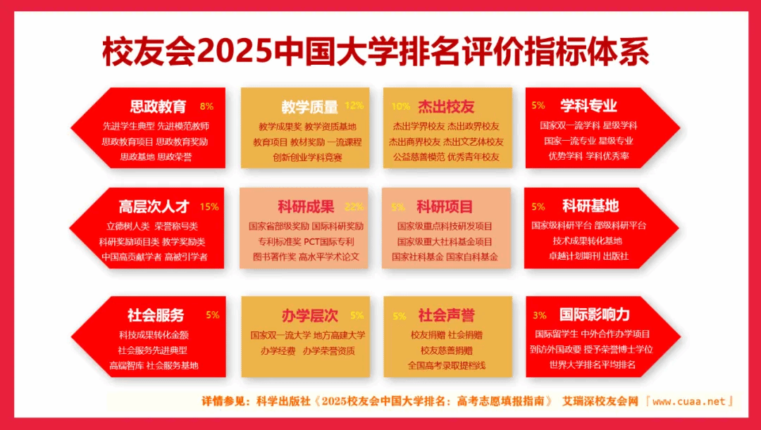 艾瑞深校友会中国大学排名首发于2003年,至今已有23年的历史,已成为具有广泛社会影响力、公信力、参考价值与创新力的中国大学排名领先品牌。校友会2025中国大学排名评价指标体系由办学层次、思政教育、教学质量、杰出校友、高层次人才、学科专业、科研项目、科研基地、科研成果、社会服务、社会声誉和国际影响力等12个一级指标组成,基于“大平台、大团队、大项目、大成果、大校友”体系框架展开系统评价,覆盖的评估指标900多项。