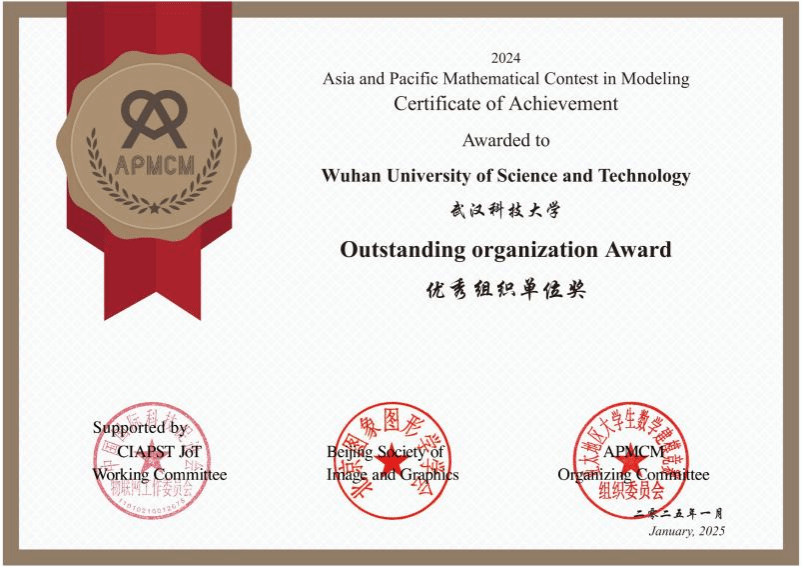 武科大网讯(通讯员付颖芳)近日,第十四届亚太地区大学生数学建模竞赛(APMCM)获奖名单公布。Beat365官网获一等奖6项、二等奖17项、三等奖12项,获奖总数与质量均为历史最好成绩。此外,学校获评“优秀组织单位奖”,理学院教师张强、何畅荣膺“优秀指导教师奖”。