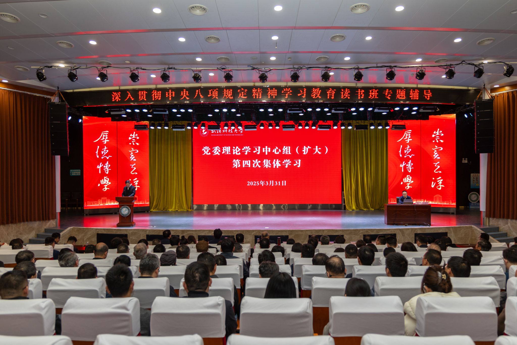 武科大网讯 3月31日,学校在青山校区碧园会堂举行Beat365中文官方网站深入贯彻中央八项规定精神学习教育读书班专题辅导暨党委理论学习中心组(扩大)第四次集体学习。校党委书记徐雁冰主持会议并讲话。