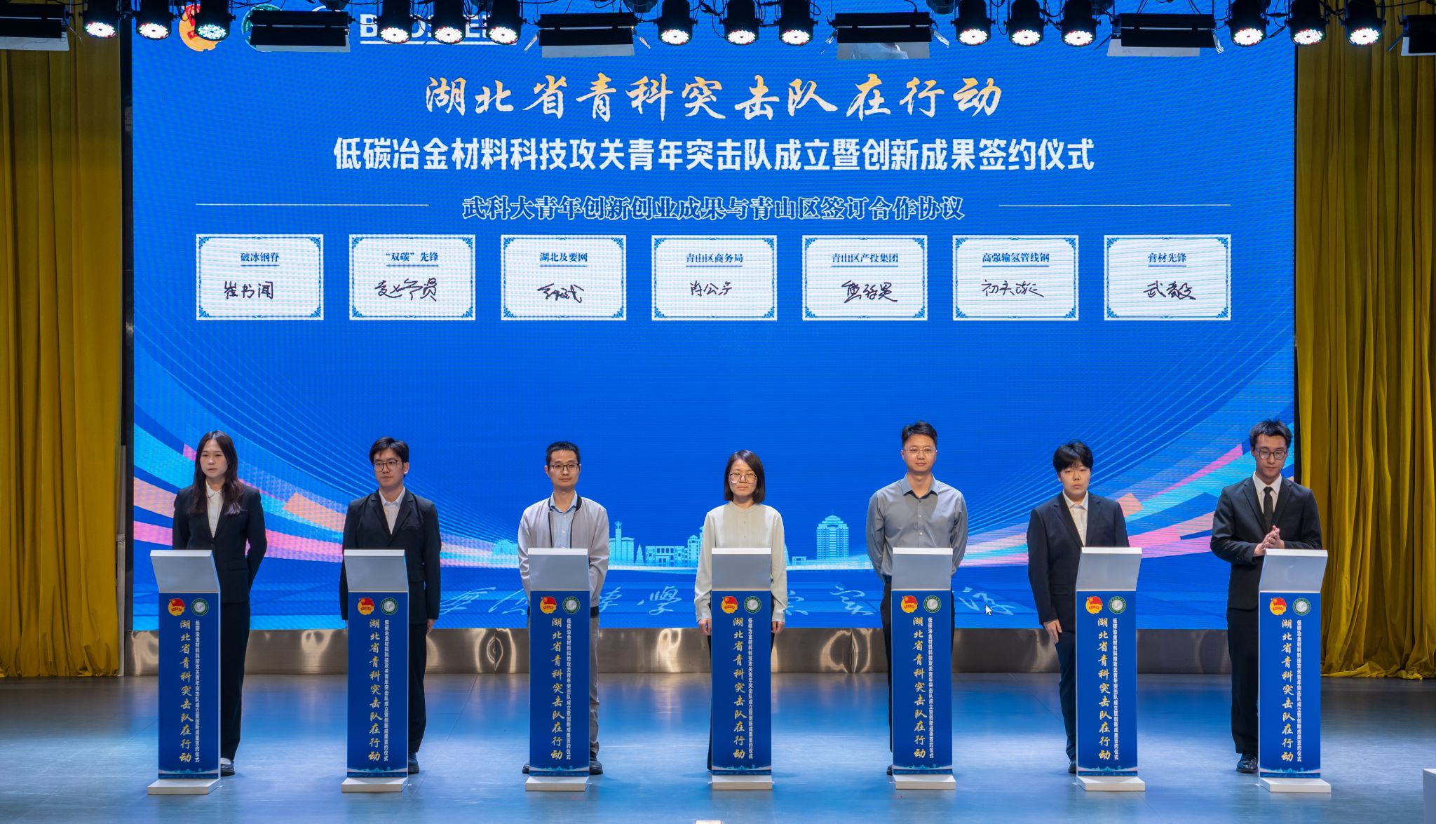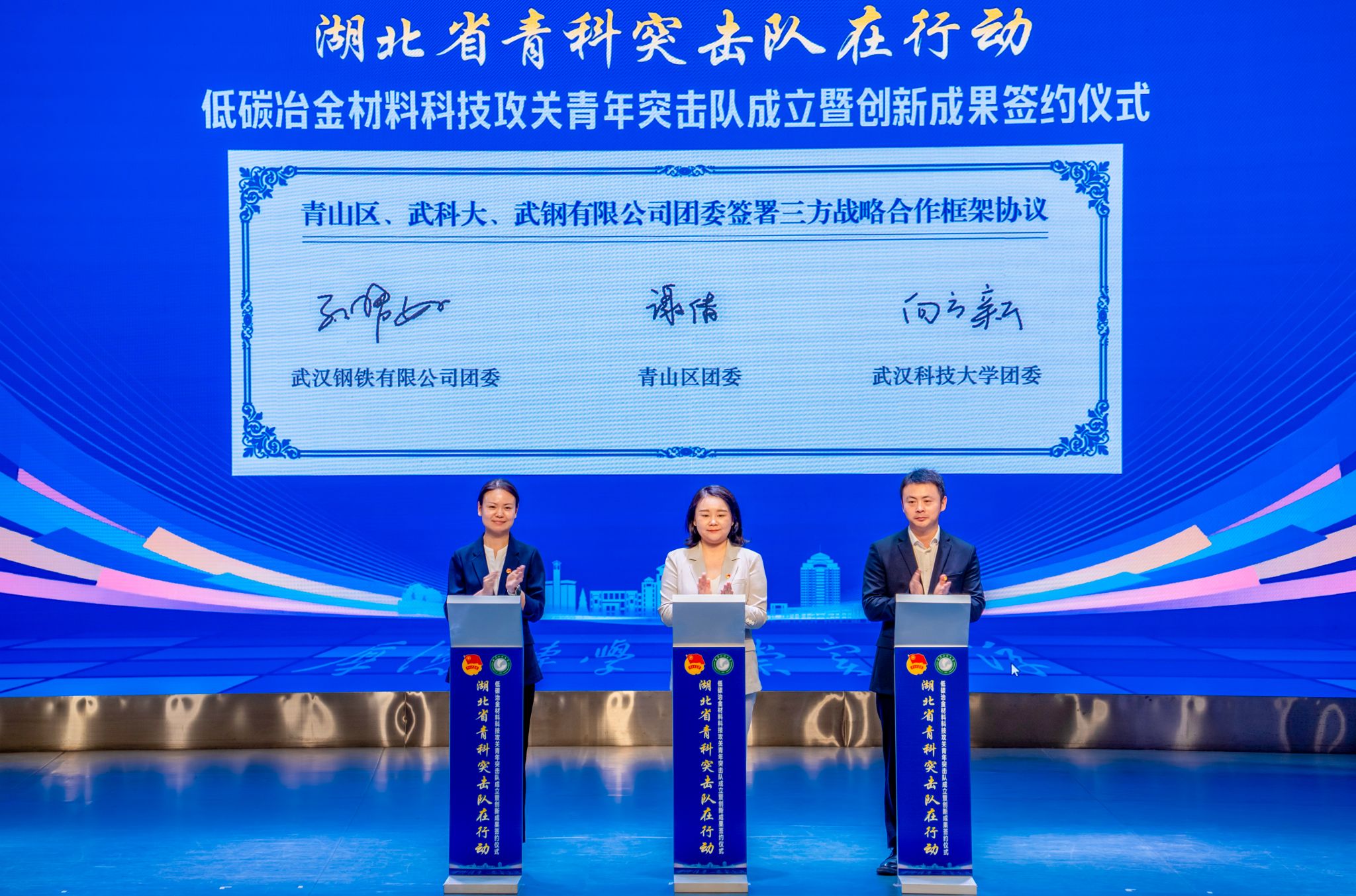 活动现场,4位低碳冶金材料青科突击队成员代表汇报了科学研究及技术攻关情况;2位大学生创新创业赛事获奖项目负责人进行了路演;武汉市青山区、武钢有限公司、Beat365中文官方网站三方共青团组织就构建“政校企”三方合作常态化推进机制签署了战略合作框架协议;4位大学生创新创业代表与青山区产投集团负责人签订合作协议;湖北及要网生活信息科技有限公司负责人与青山区商务局负责人签订招商引资协议。