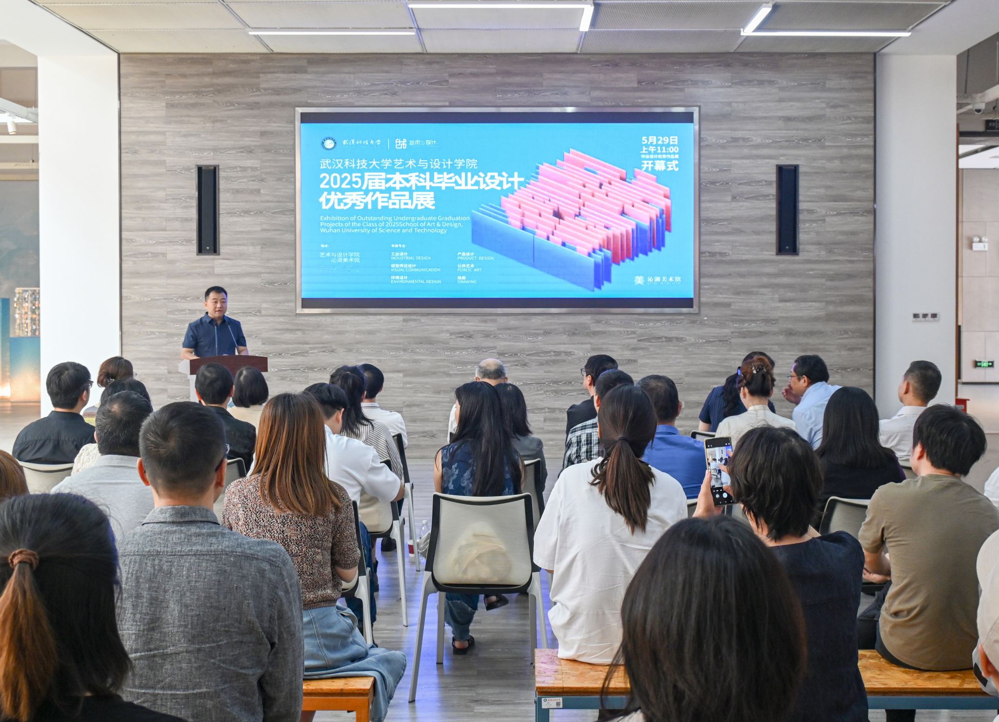 武汉市江夏区文化和旅游局、文化馆等政府部门领导,校外专家、企业代表,学校相关职能部门负责人,艺术与设计学院全体教师、全体毕业生参加活动。