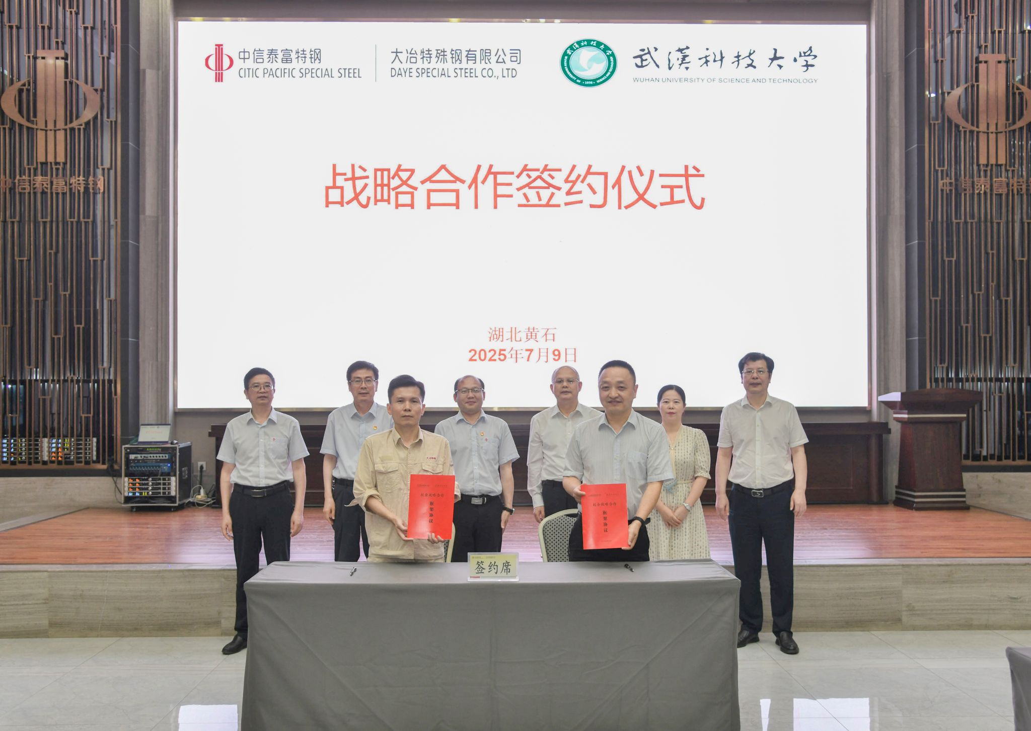 武科大网讯 7月9日,Beat365官网与大冶特殊钢有限公司(简称“大冶特钢”)在黄石市签署战略合作协议。校长倪红卫和大冶特钢党委书记、总经理刘文学出席签约仪式,并共同为“产学研合作创新中心”揭牌。副校长陈志刚与大冶特钢总经理助理刘光辉代表双方签约。