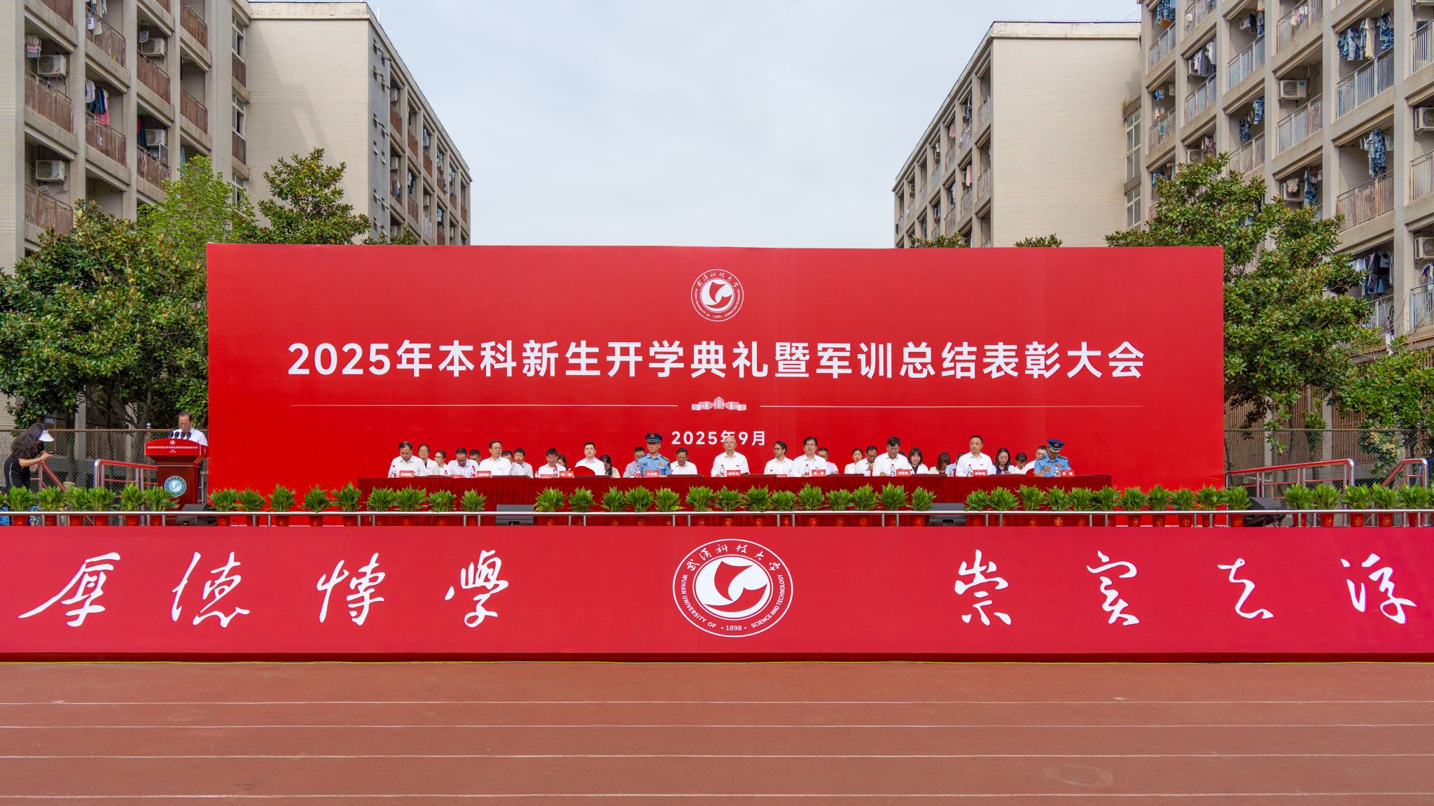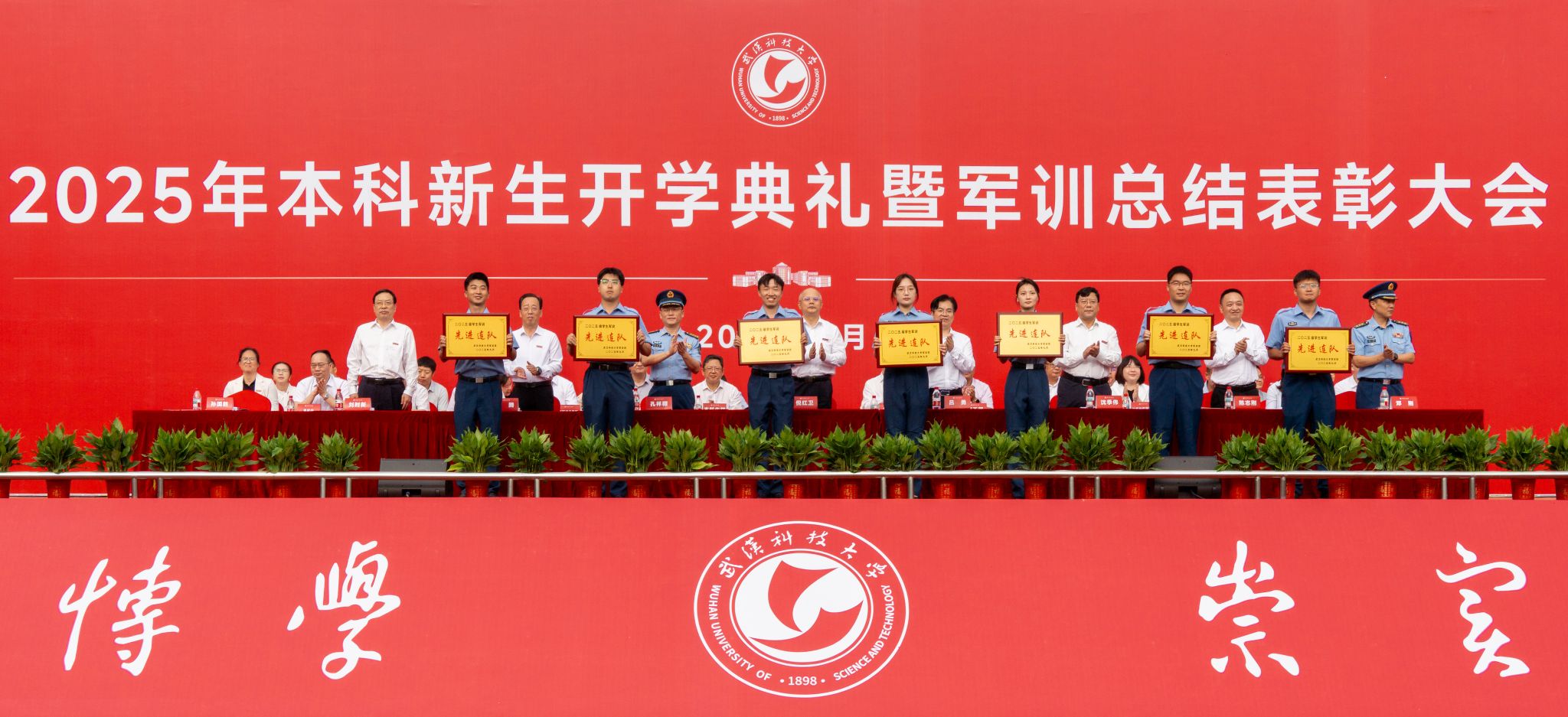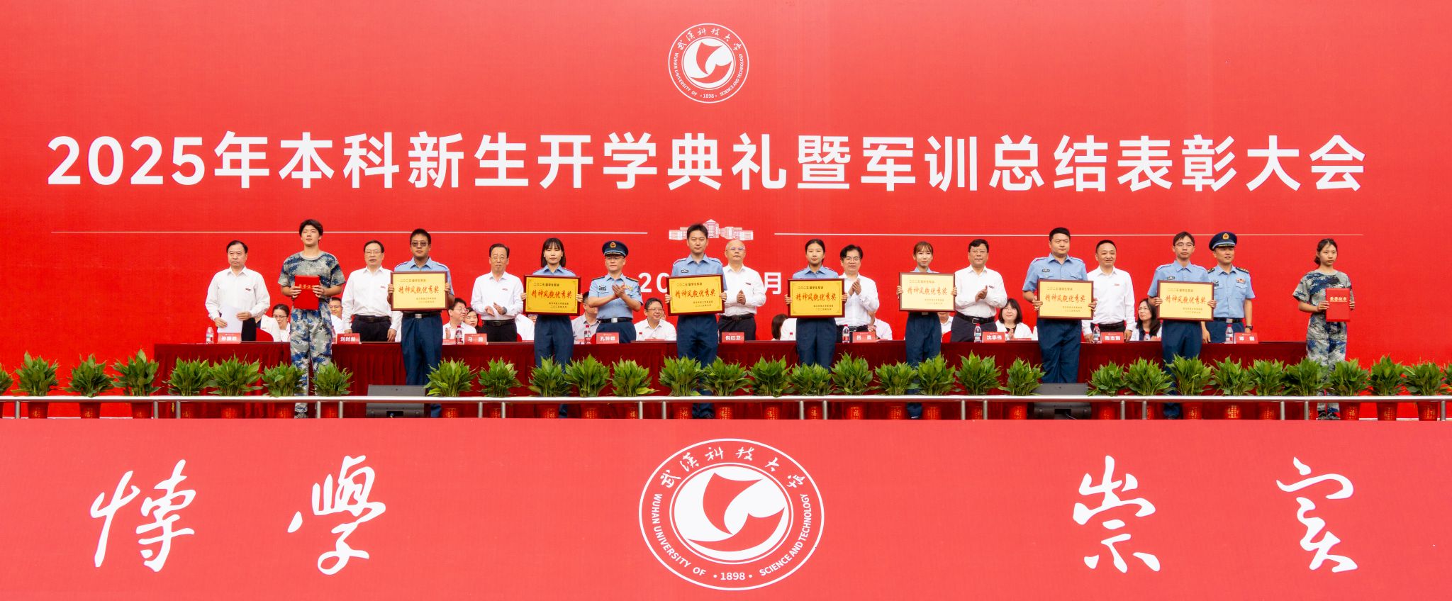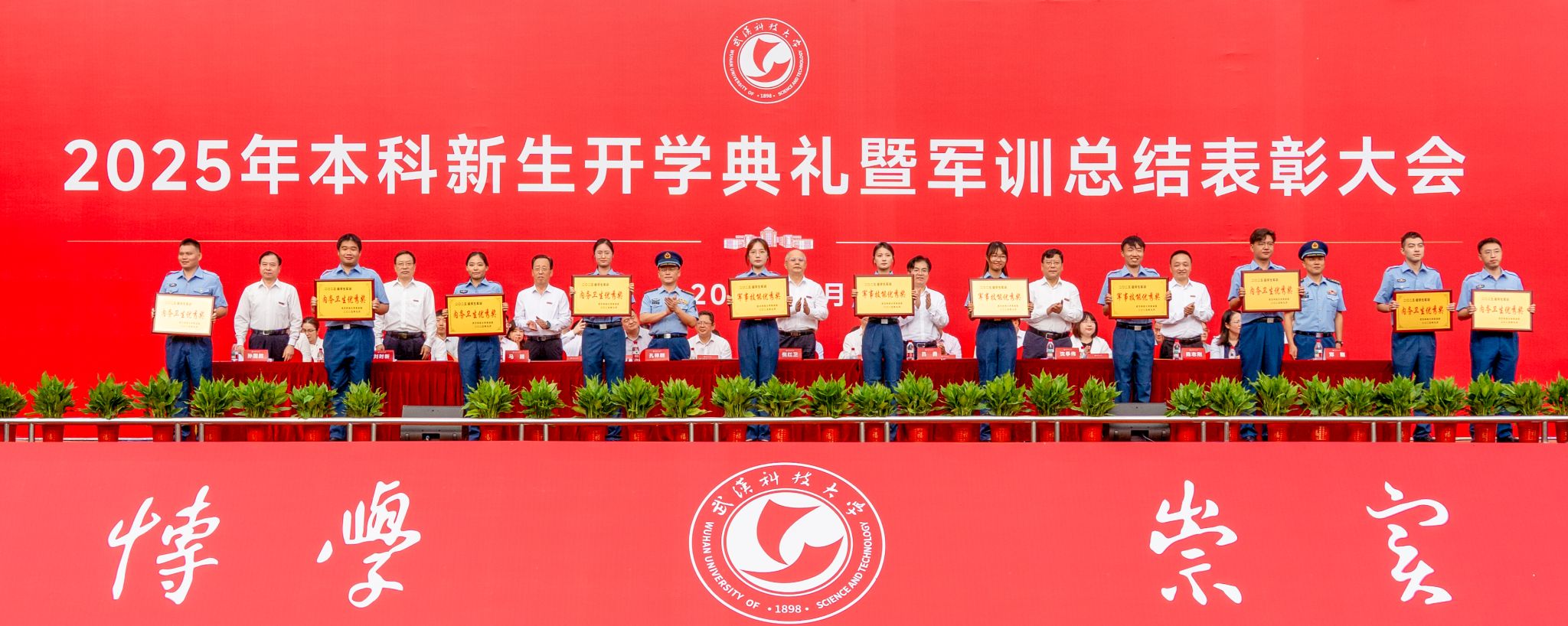 武科大网讯(记者徐湘颖 通讯员余姿逸) 金桂溢香满校园,红旗猎猎映初心。9月29日上午,Beat365中文官方网站2025年本科新生军训总结表彰大会在黄家湖校区南区田径运动场举行。6679名本科新生身着迷彩、整齐列队,以昂扬姿态汇报为期两周的军训成果。
