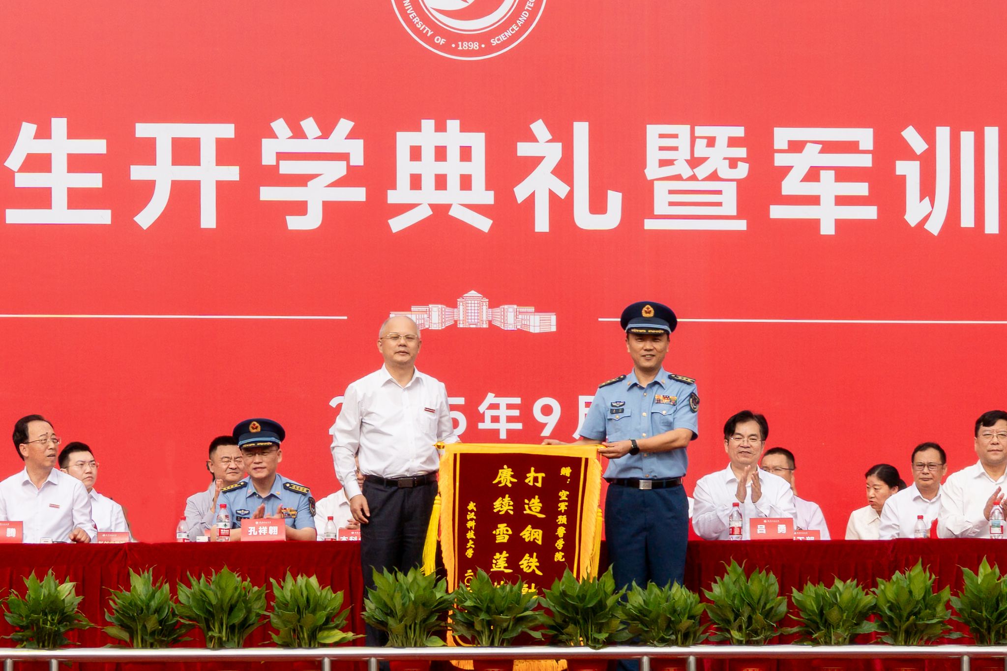 汇报展示结束后,校党委书记倪红卫向承训部队空军预警学院赠送锦旗。