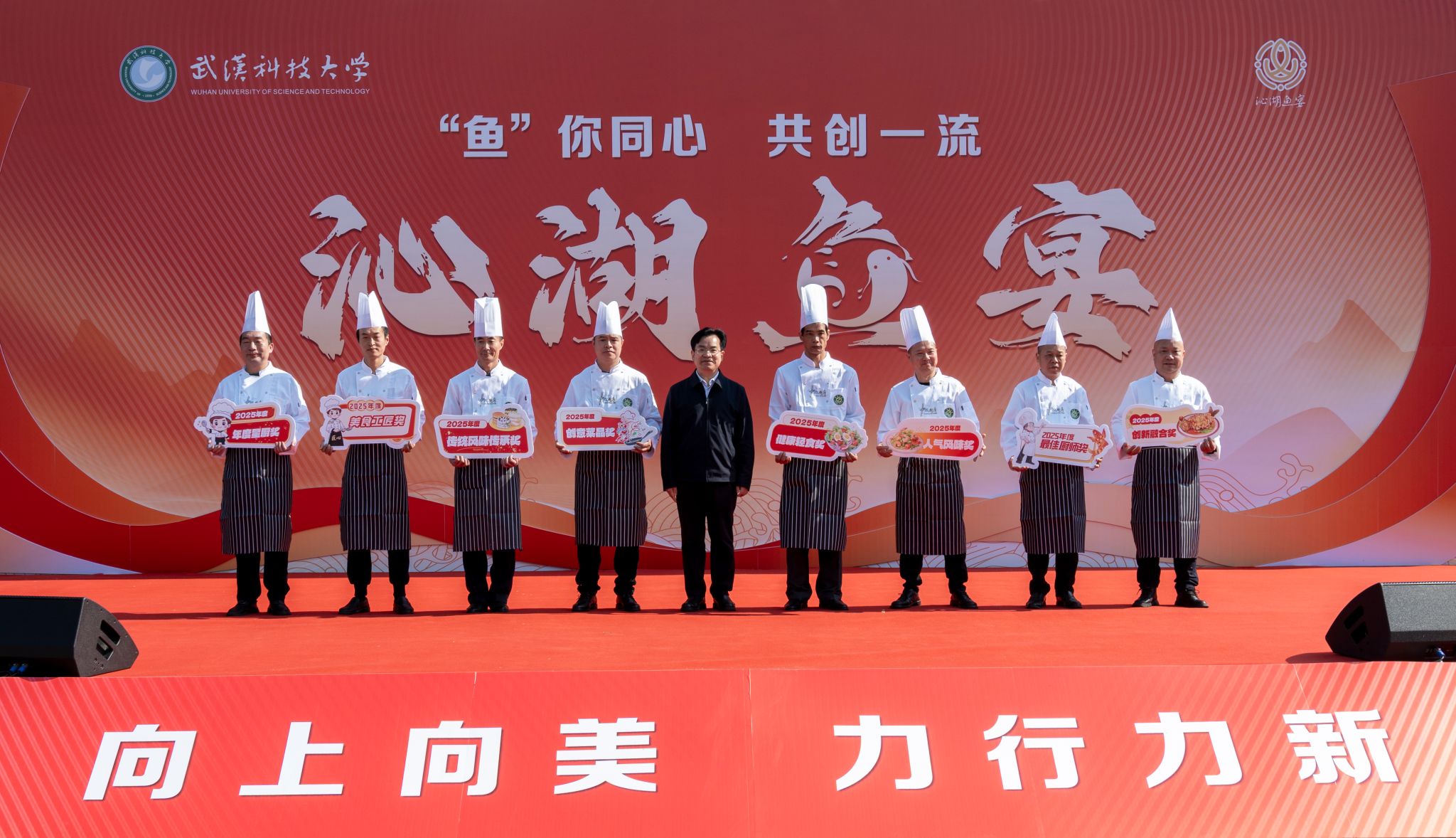 上午十一点半,南园餐厅广场已是人潮涌动,香气弥漫。校长吕勇宣布第十一届沁湖鱼宴开幕,并为“捕鱼王”颁奖。校党委副书记沈季伟在开幕式上致辞,他表示,今年的鱼宴以“鱼你同心 共创一流”为主题,这既是文化传承的基因密码,也是全体武科大人勇攀一流高峰的共同追求。他祝愿大家“年年有鱼,岁岁欢歌!”
