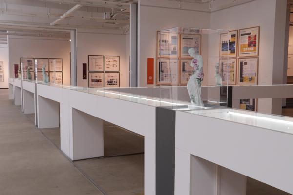 走进沁湖美术馆,映入眼帘的是两个T型展示台。展示台为简洁的黑白色,台面上陈列着林家阳编著的书籍、获奖证书、创作的艺术品等,展现了林家阳在设计领域的深耕历程和成果。