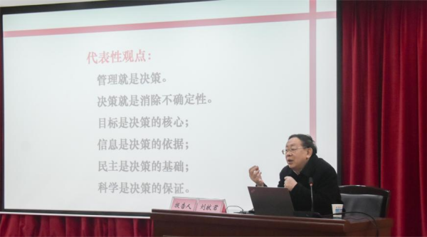 3月25日上午,华中科技大学教科院教授、博士生导师,文华学院副董事长、院长刘献君以《高校决策的若干特点及其应对方略》为题,进行专题教学。刘献君结合自身多年高等教育实践与研究经验,讲授了关于高校决策和发展的原创性、开创性思想和理念,从高校决策要为教学、科研创造自由的条件,高校决策的三种类别,容易出现的问题和对国家未来产生深远影响等方面阐释了高校决策的特点、规律,并提出要增强把握大局确立目标的能力、调查研究抓住问题的能力、锐意创新实现转变的能力、规划与协调能力,提高大学治理决策能力水平。