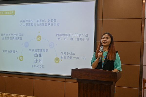 宣讲会上,陈家琪从项目介绍、报名流程、志愿者待遇、优惠政策及相关问题五个方面进行讲解。她表示本次专项志愿活动由共青团中央、教育部财政部、人力资源和社会保障部联合实施,涵盖西部地区的2100多个县(市、区、旗)基层乡镇。她强调西部计划在通过笔试面试、体检、确认录取信息后就可培训上岗。