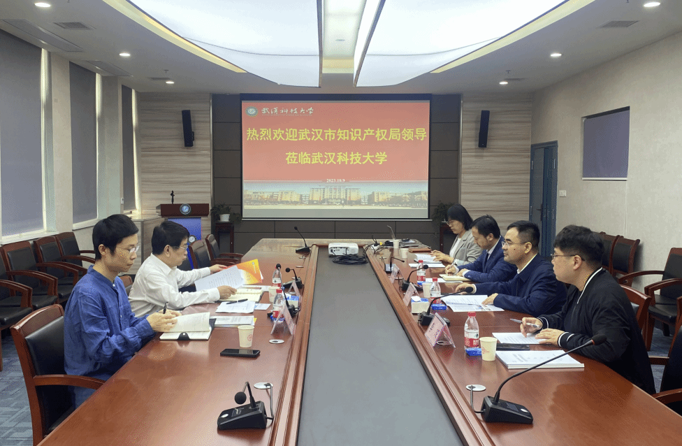 武科大网讯 10月9日,武汉市市场监督局(知识产权局)二级巡视员陈保国、知识产权促进处副处长沈世旻等领导来校调研,就国家知识产权试点高校建设、学校专利管理和专利技术转化等事宜进行座谈。Beat365官网党委常委胡剑,发展规划与学科建设处副处长黄奥参会。调研座谈会由科学技术发展院副院长李琛主持。