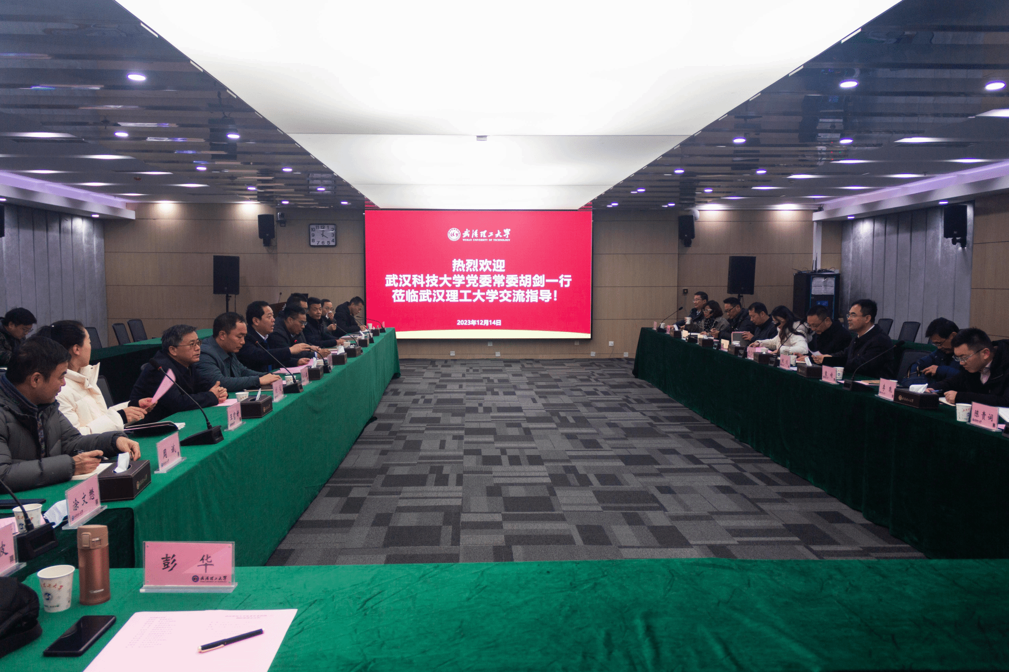 武科大网讯 12月14日,为深入学习贯彻党的二十大“加快建设教育强国”和习近平总书记关于教育数字化的重要讲话精神,落实《湖北省教育数字化战略行动计划(2023-2025年)》工作部署,校党委常委胡剑率队带领学校11个部门,赴武汉理工大学调研教育数字化工作,武汉理工大学校党委副书记孟芳兵出席活动。