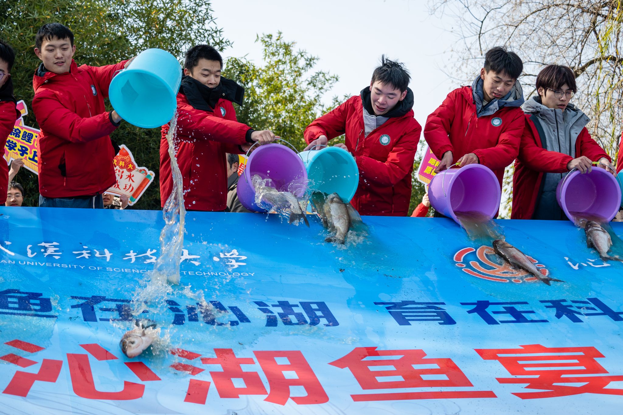 启动仪式现场人潮涌动,师生近百人聚集在沁湖旁,参与“放鱼”。学校党委常委胡剑出席仪式。