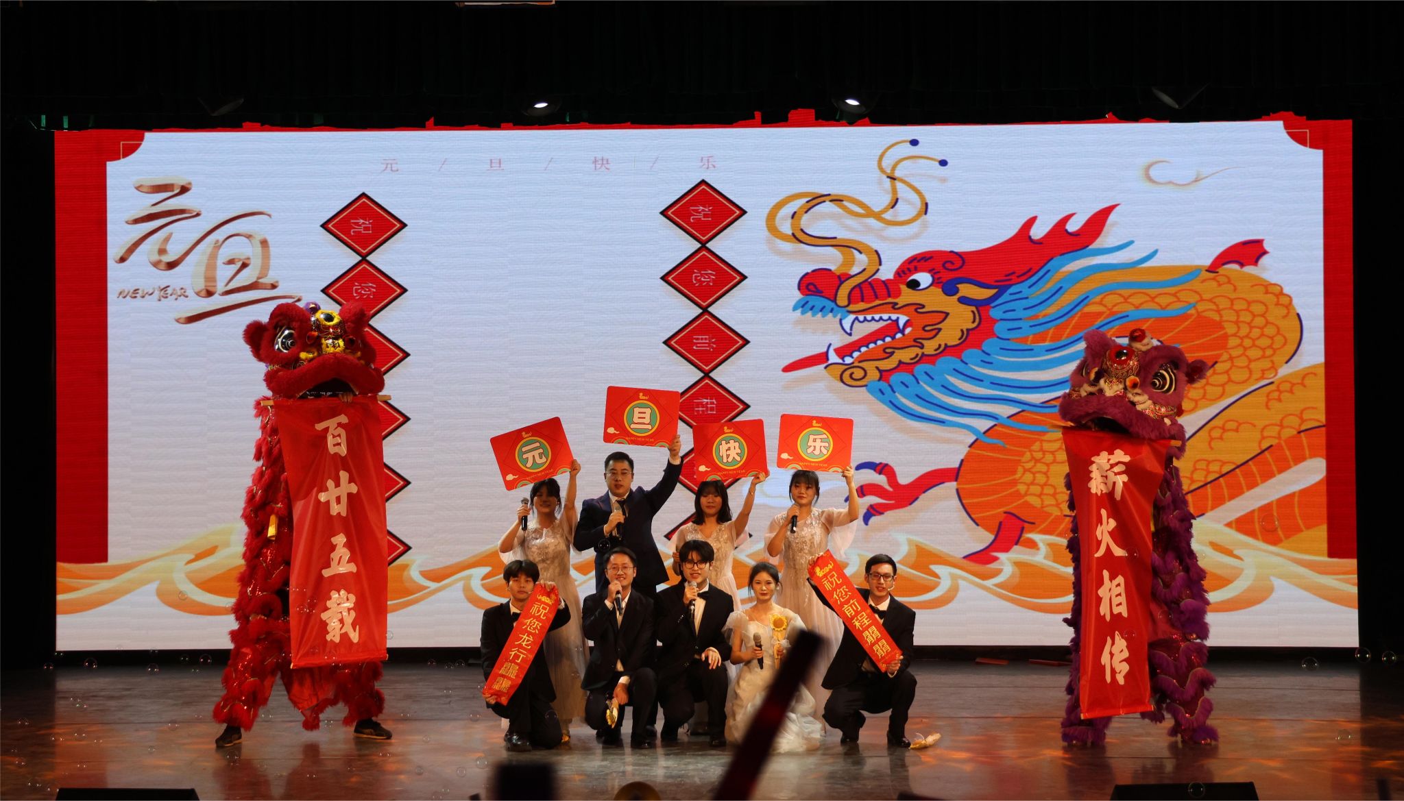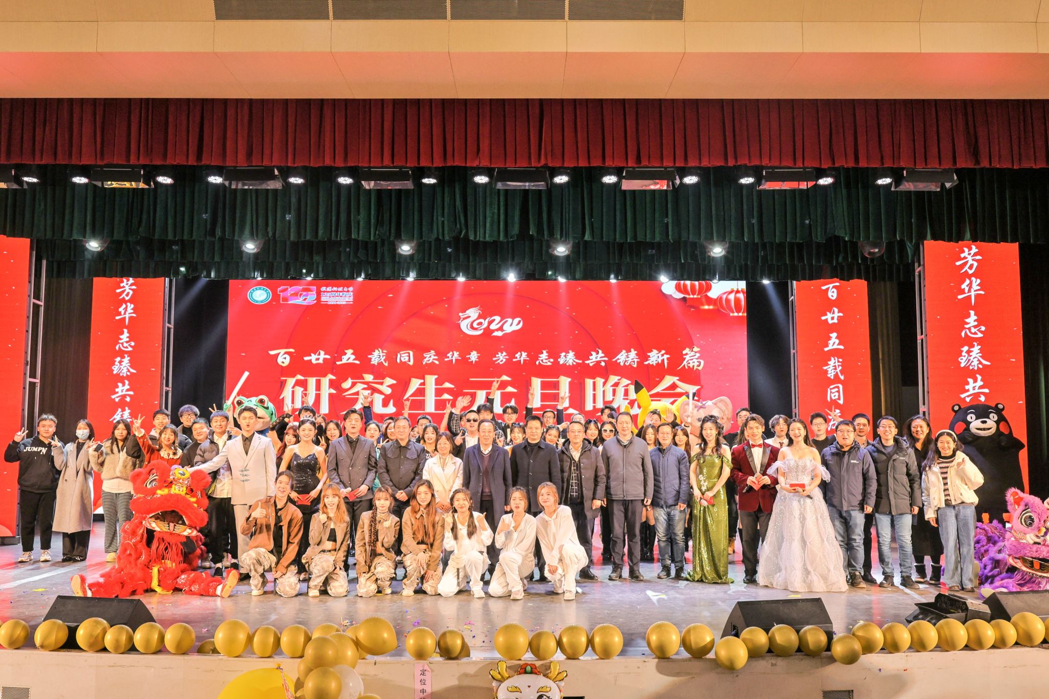表彰结束之后,2024年研究生元旦晚会由彭九九、刘兆天、申博源、贾喻圆、郭锐琦、戴雨薇六位同学主持。研究生各培养单位、研究生舞蹈队、武汉说唱团、大学生艺术团以及魔术协会共同为现场观众带来精彩纷呈的晚会节目。快板《比》、歌曲《星星》、舞蹈串烧《Hot Issue》《Hype Boy》 《Mix Pop》将晚会引入高潮。晚会设置多轮抽奖和互动环节,赵凯、冯涛、毛宝胜作为抽奖嘉宾为现场观众抽取奖品。音乐声、欢笑声、喝彩声交织在一起,形成了一曲欢乐的交响乐,现场观众都沉浸在欢愉的氛围中。