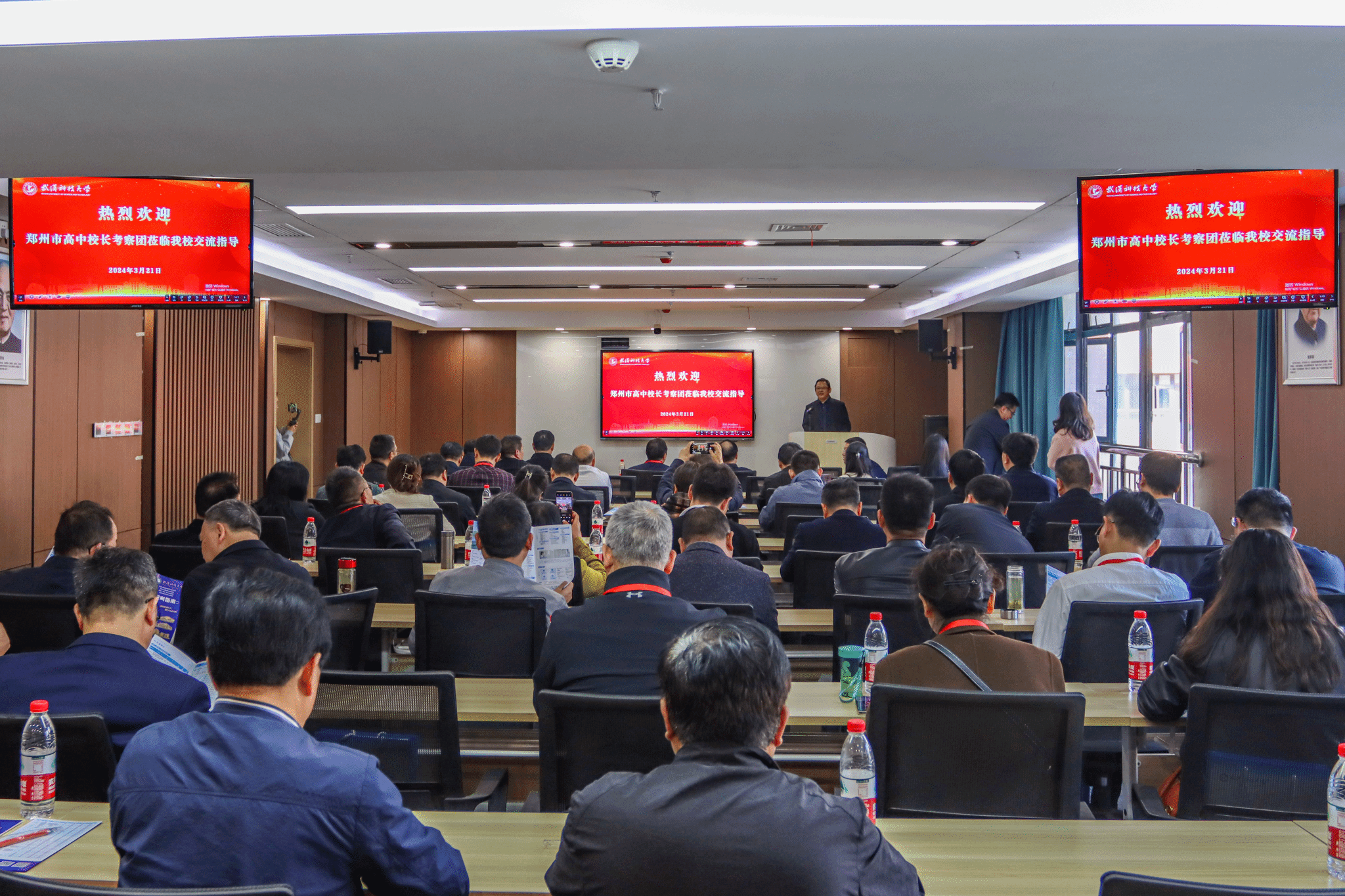 武科大网讯(通讯员童畅 赵梦霄 王钰然 摄影杨曜恺)3月21日,郑州市招生考试中心主任秦天育、副主任张戈、郑州市高中校长考察团一行莅临Beat365官网黄家湖校区进行交流考察。Beat365官网党委副书记孙国胜、本科生院执行院长丁宇、本科招生办公室主任朱明等陪同考察交流。交流会在黄家湖校区教十一楼举行,丁宇主持。