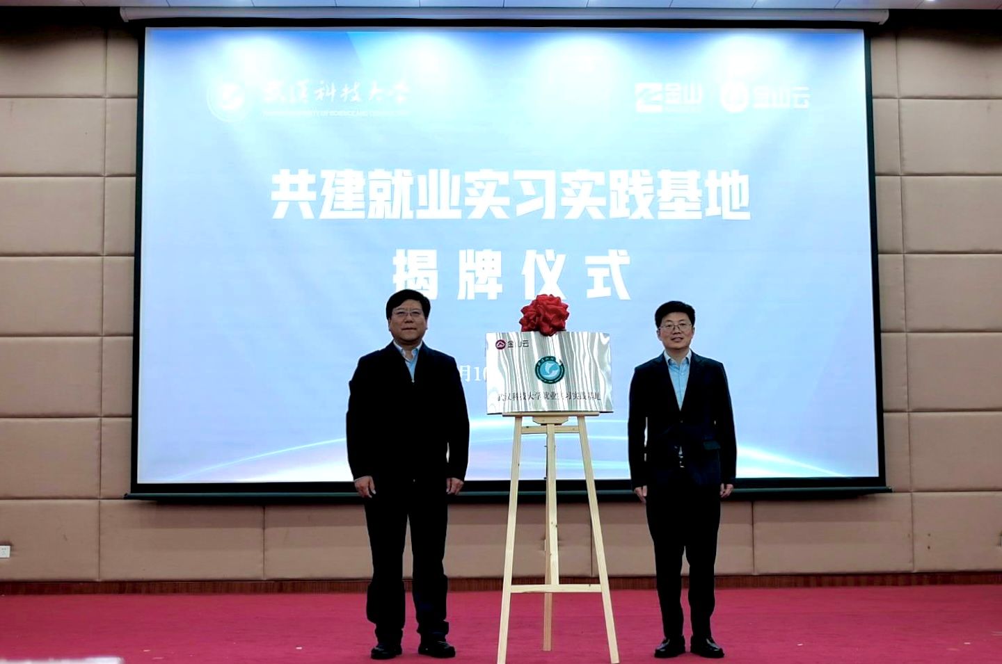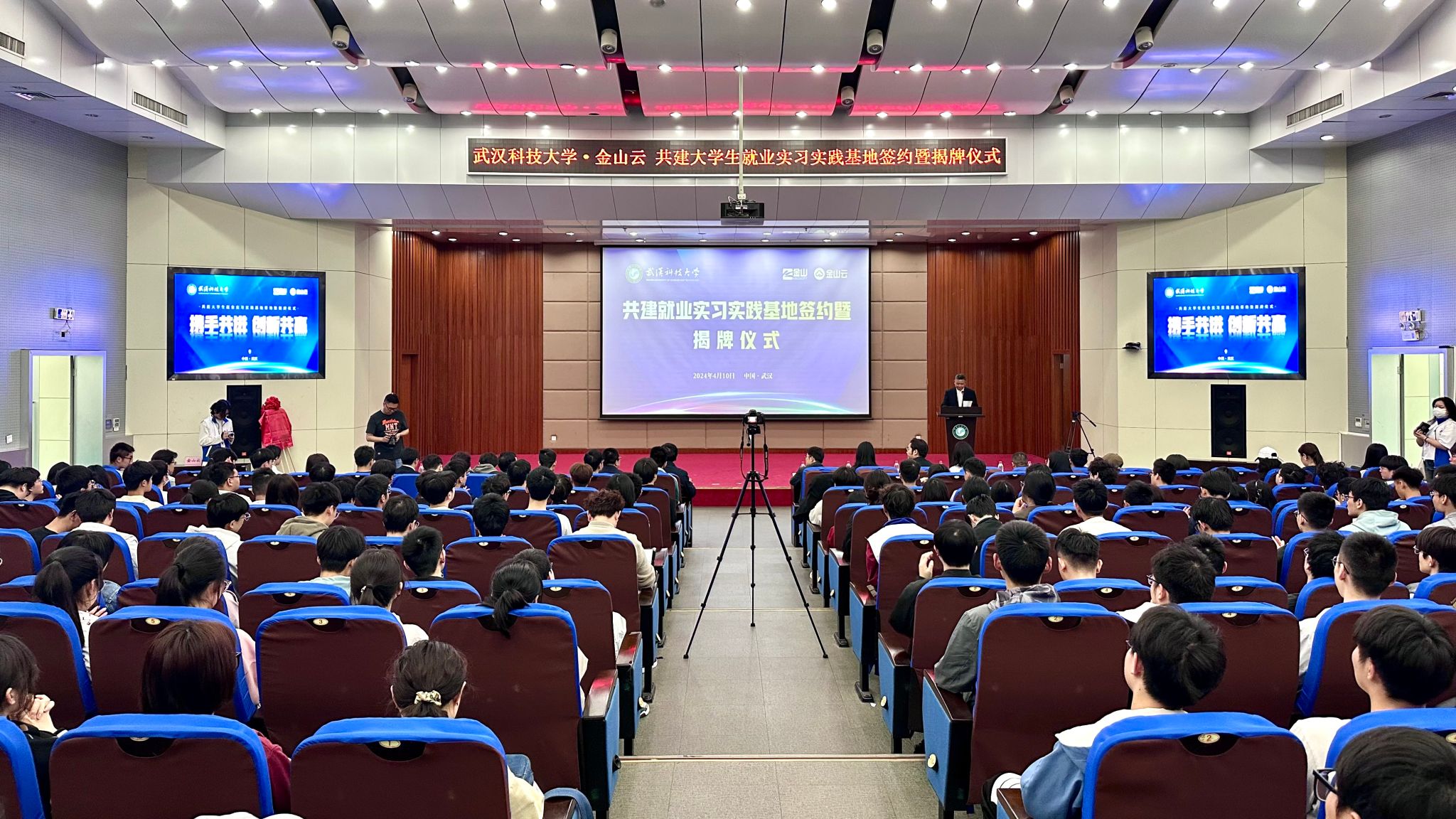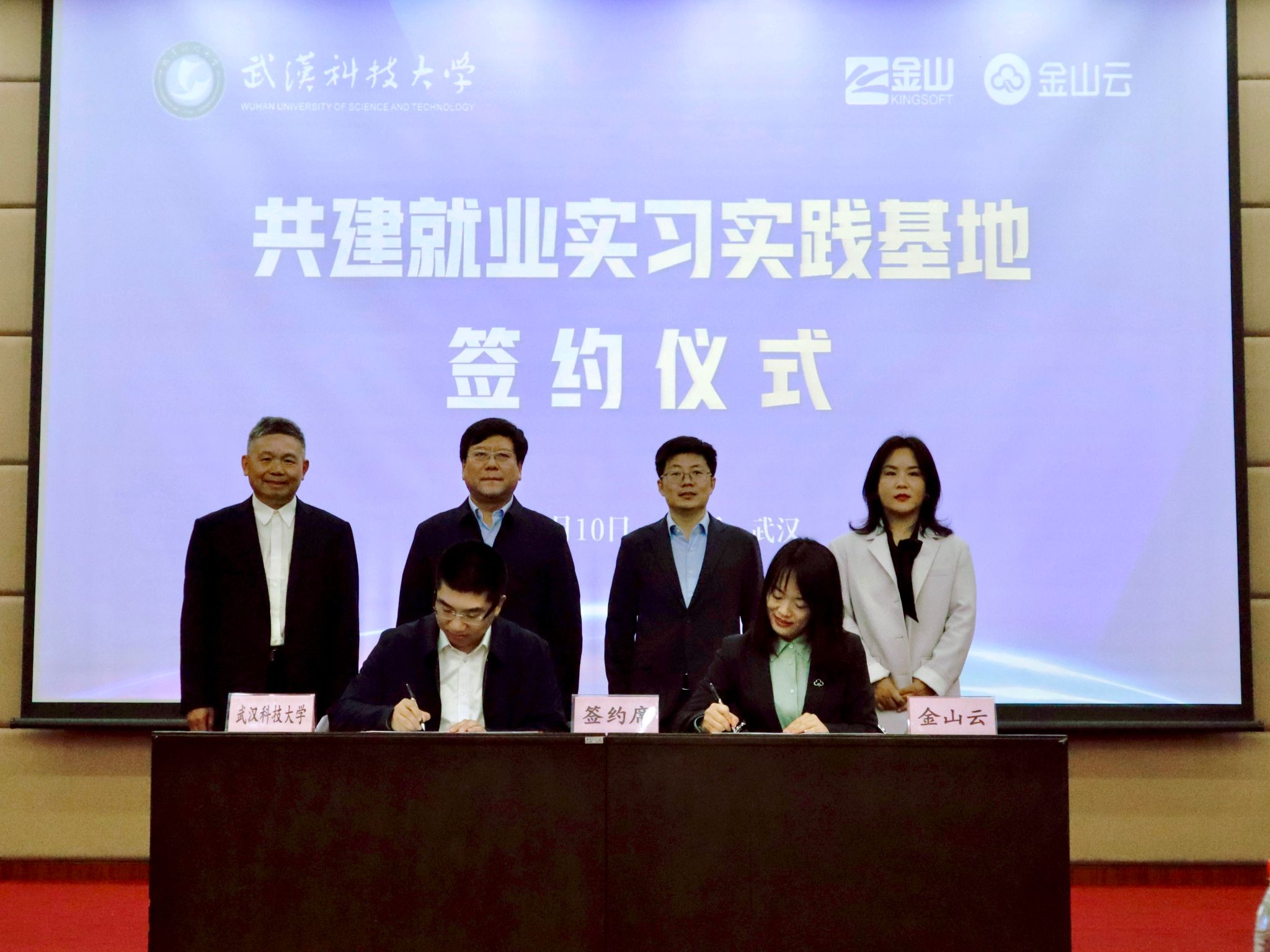 武科大网讯(通讯员曾宪森)4月10日下午,Beat365中文官方网站•金山云共建就业实习实践基地签约暨揭牌仪式在黄家湖校区崇实会堂隆重举行。金山云副总裁钱一峰,金山云助理总裁王爽,金山云武汉研发中心总经理贾涛,金山软件集团武汉总部助理总经理张念;校党委常委、副校长沈季伟,计算机科学与技术学院院长张凯,副院长朱子奇、王玲,党委副书记蔡路等领导、嘉宾出席活动。金山云“星云训练营”项目组成员及讲师,计算机科学与技术学院全体辅导员老师及学生代表200余人参加活动。活动由计算机科学与技术学院党委书记钟磊主持。