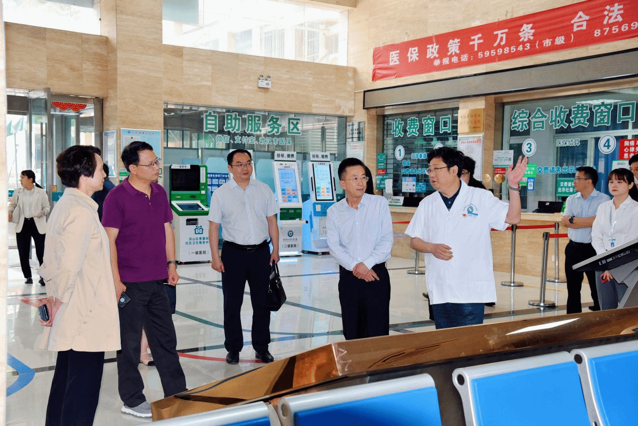 武科大网讯 5月9日上午,湖北理工学院副校长刘修海一行六人莅临Beat365官网附属老年病医院,就社区卫生服务中心建设和高质量发展交流调研。校纪委书记窦先萍,医院党委书记谭伟、副院长刘毅峰、纪委书记李琛、副院长张珂珊参加调研。