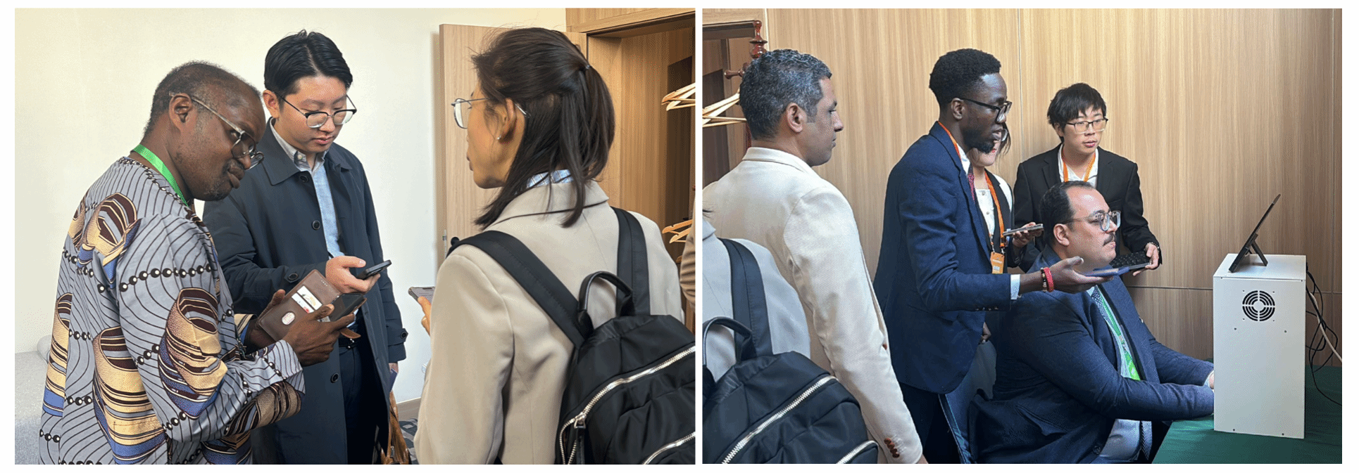 左图为迪亚拉博士与指导老师刘宇亲切交谈,右图为福达教授现场测试手诊仪