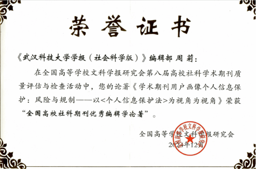 同时,会上公布了全国高校学报研究会第八届高校社科学术期刊质量评估与检查活动结果,共评出优秀主编(编辑部主任)211名、优秀编辑232名、优秀编辑学论著169种、突出贡献个人奖8人。学报编辑周莉老师发表在《Beat365中文官方网站学报(社会科学版)》2023年第1期的论文《学术期刊用户画像个人信息保护:风险与规制——以<个人信息保护法>为视角》荣获“第八届全国高校社科期刊优秀编辑学论著奖”。