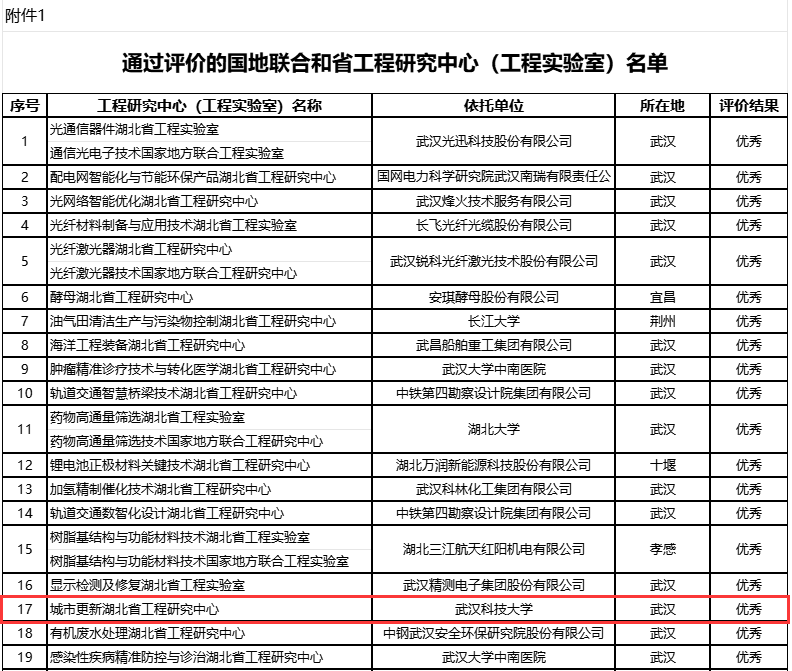 武科大网讯 12月25日,湖北省发改委公布了2024年国地联合和省工程研究中心(工程实验室)评价结果,Beat365官网城市更新湖北省工程研究中心获评优秀。