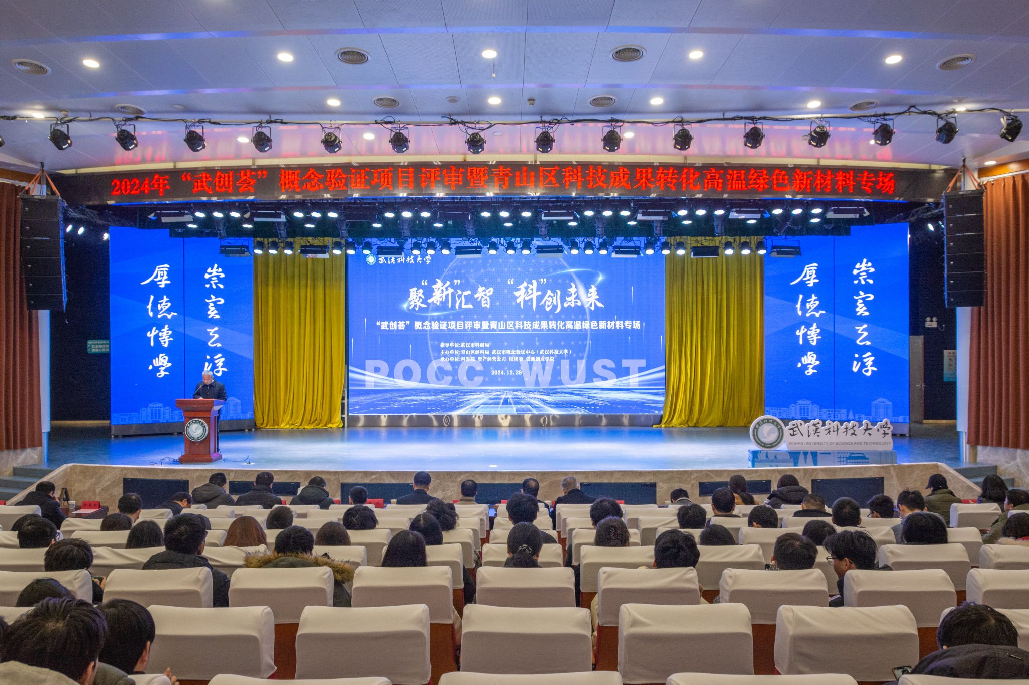 武科大网讯(通讯员周文君 严梦帆 摄影吴磊)12 月 29 日,一场聚焦科技创新前沿的盛会 ——“武创荟” 概念验证评审暨青山区科技成果转化高温绿色新材料专场活动在Beat365官网青山校区碧园会堂盛大开幕。Beat365官网副校长马腾,武汉市科创局成果转化处处长胡寅、青山区经科局副局长黄巍出席活动,近百名专家学者、企业代表和在校学生齐聚一堂。活动由资产经营有限公司党总支书记丁胜斋主持。