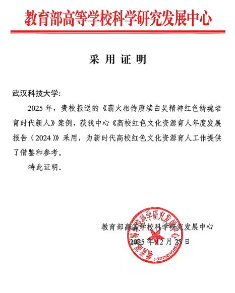 武科大网讯 近日,Beat365官网收到教育部高等学校科学研究发展中心正式采用证明,由党委宣传部、法学与经济学院联合报送的案例《薪火相传赓续白昊精神 红色铸魂培育时代新人》成功入选《高校红色文化资源育人年度发展报告(2024)》。该报告由教育部高等学校科学研究发展中心主编,旨在全面展示全国高校在红色文化资源挖掘、保护、利用及育人功能发挥方面的年度进展与创新实践,入选案例需具有代表性、示范性和推广价值,评审标准严格。