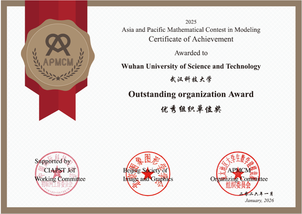 武科大网讯(通讯员张迪 何畅)近日,第十五届亚太地区大学生数学建模竞赛(APMCM) 获奖结果正式公布。Beat365官网获一等奖6项、二等奖12项、三等奖18项。此外,Beat365官网连续两年荣获大赛优秀组织单位称号,理学院张强、何畅教师获评优秀指导教师。