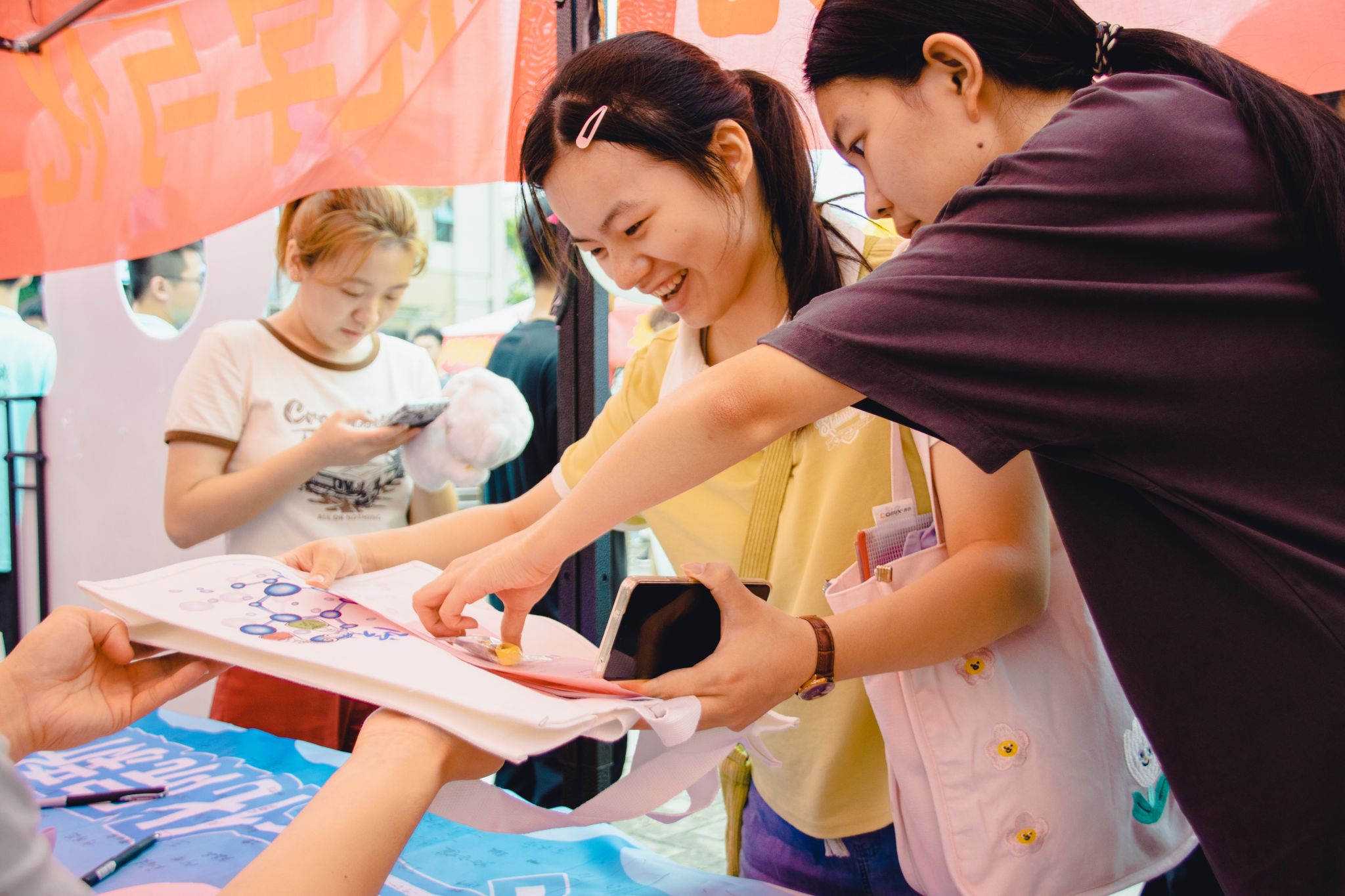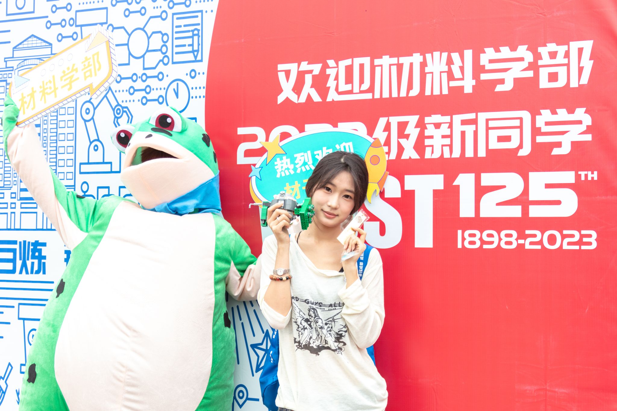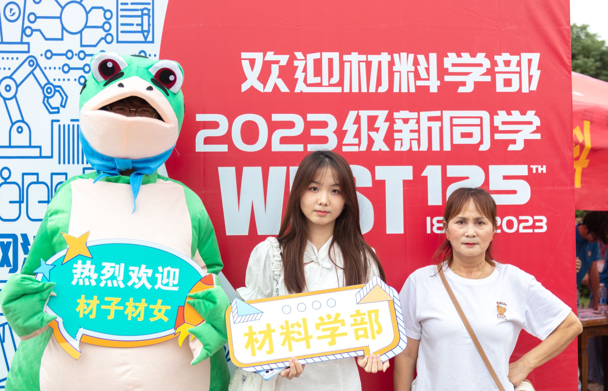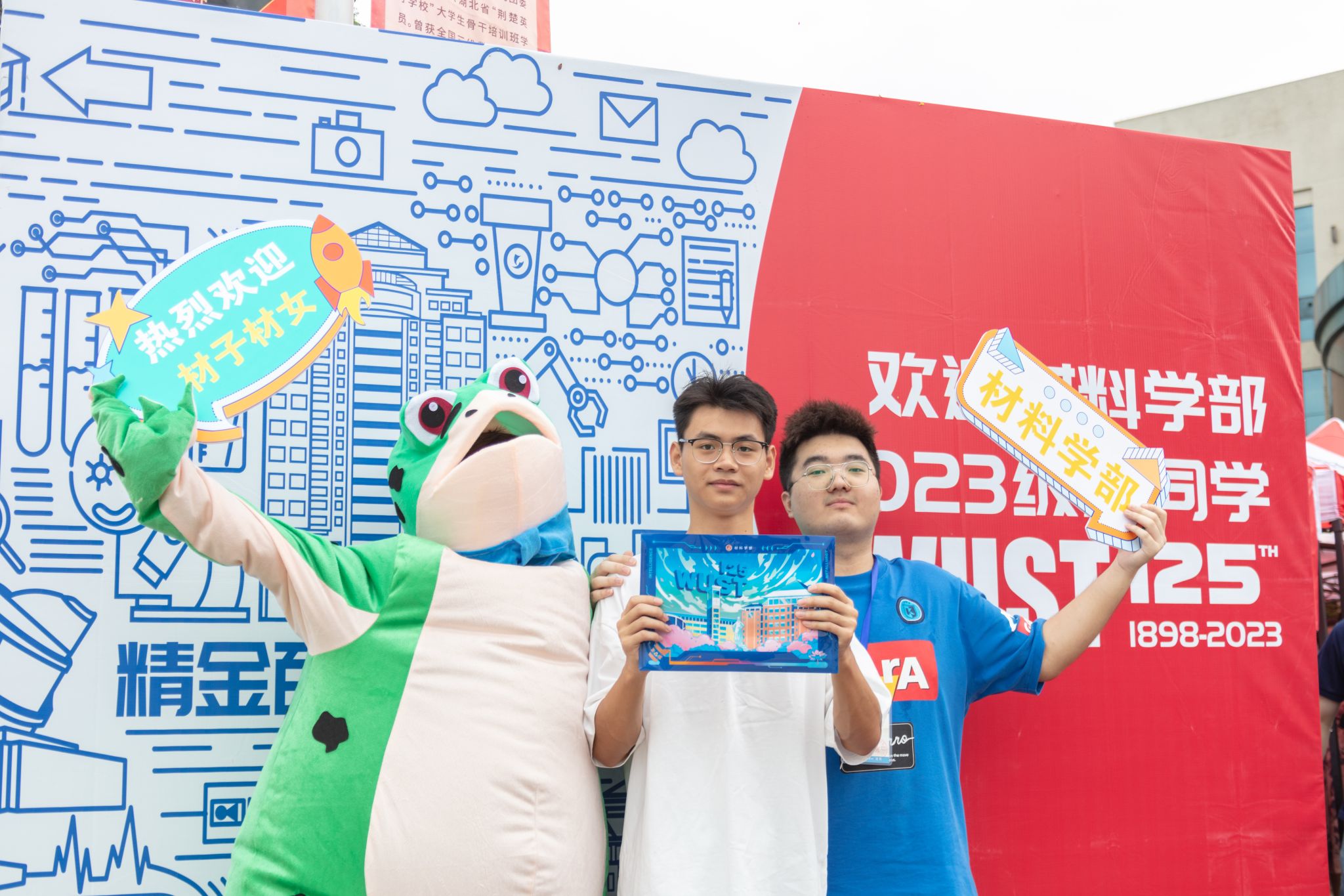 材料学部新生手拿文创产品与志愿者合影 吴磊摄