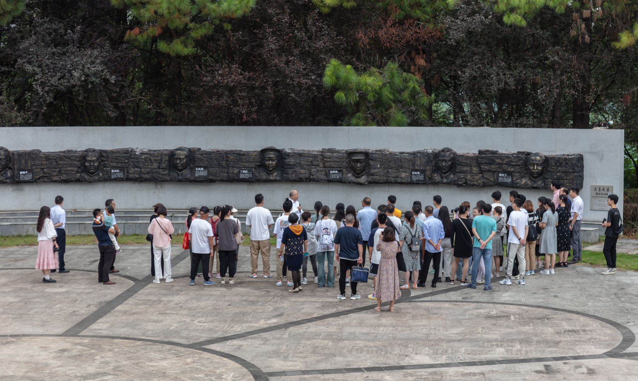 校长带领新生以及家长参观张之洞像 杨佳伟摄