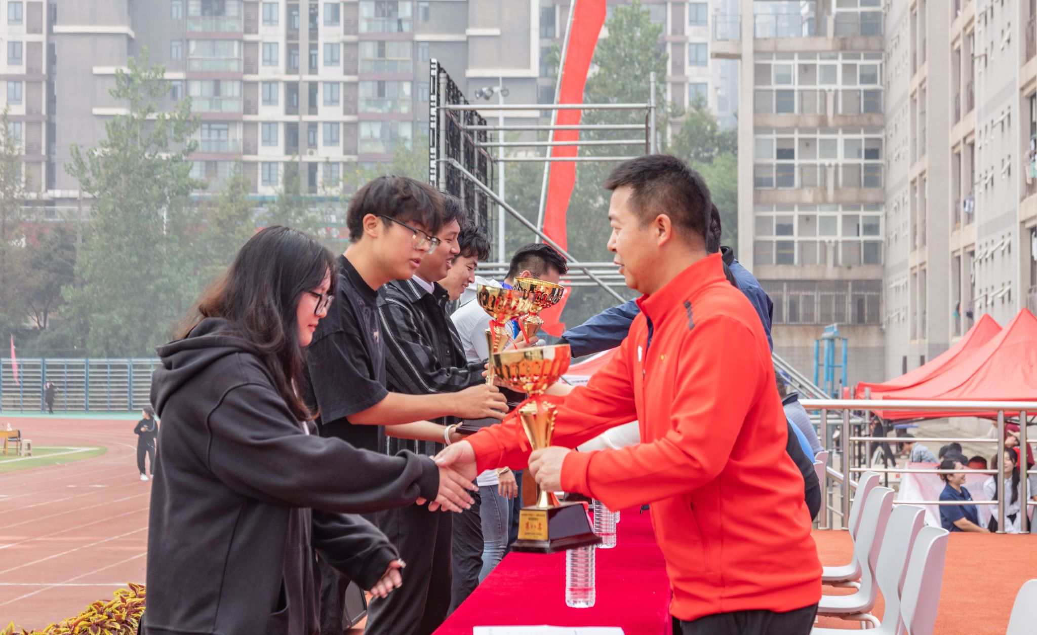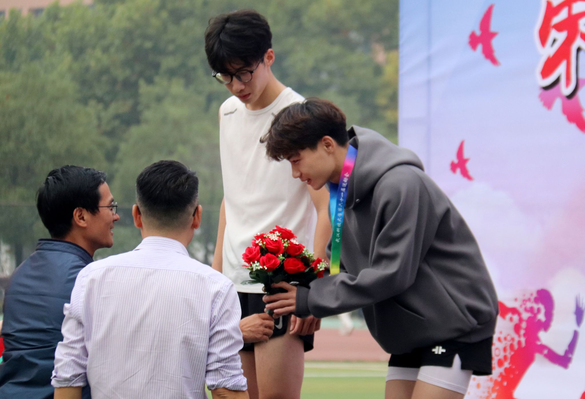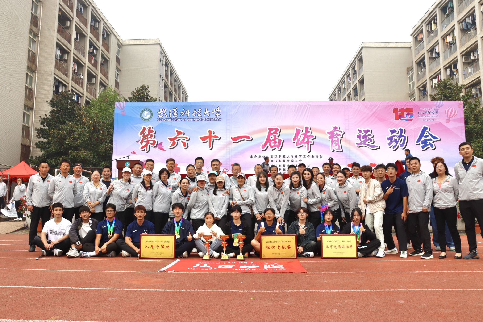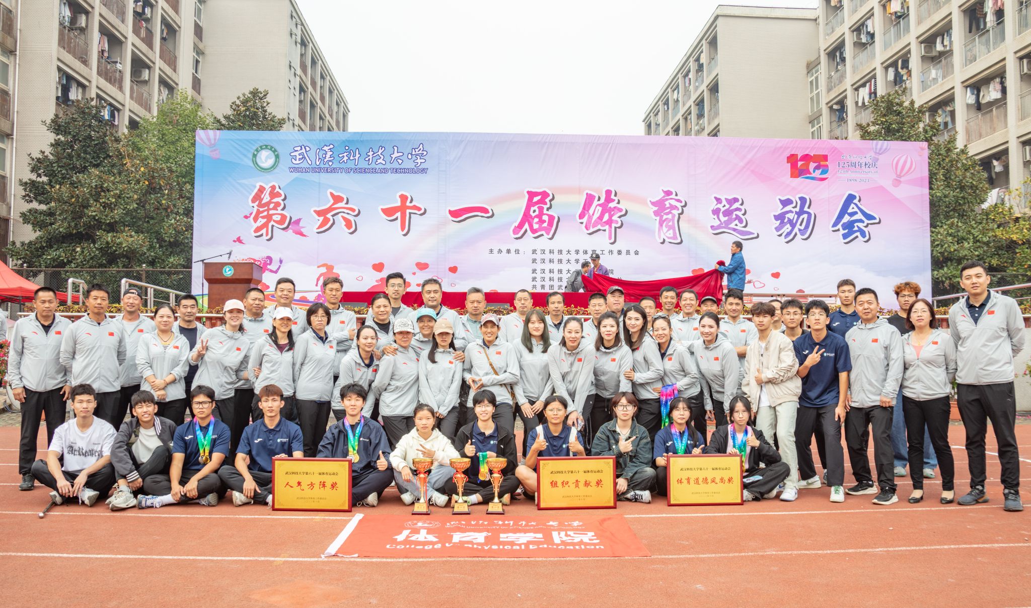 10月28号上午十一点,Beat365官网在南苑操场举行第六十一届体育运动会闭幕式。闭幕式上,第一项由运动会赛事主管敖德江宣布竞赛结果,第二项学生工作处处长许立桥老师宣布“体育道德风尚奖”评比结果,第三项体育学院副院长王路遥老师宣布“组织贡献奖”获奖单位,第四项党委宣传部常务副部长饶红亮老师宣布“最美人气方阵”,第五项为领奖仪式。颁奖结束后,老师团体以及学院方阵合影留念。(潘梦颖)