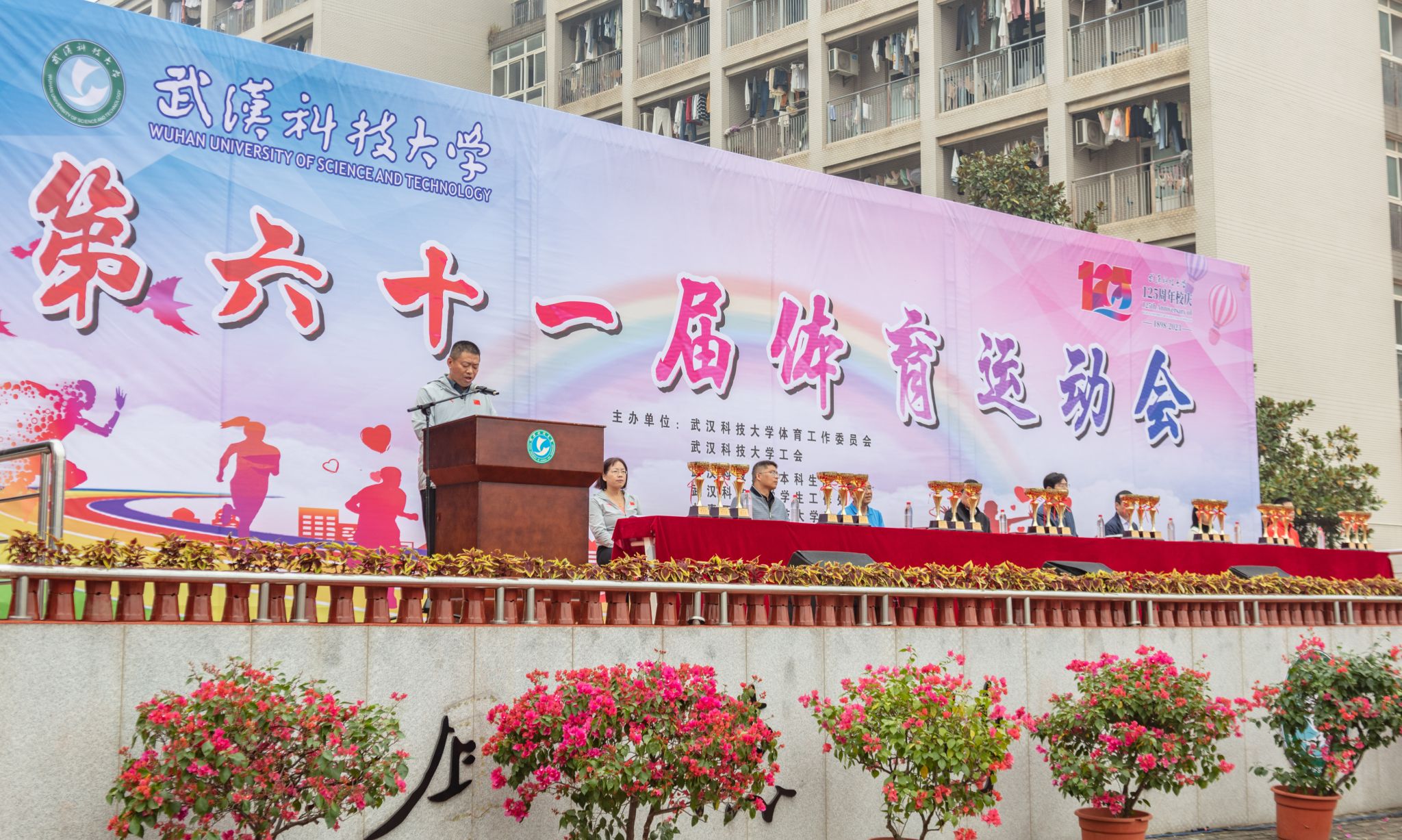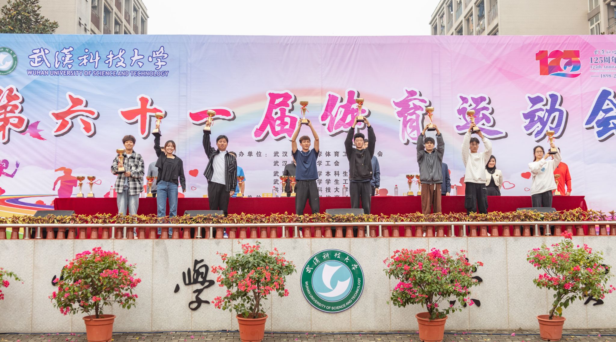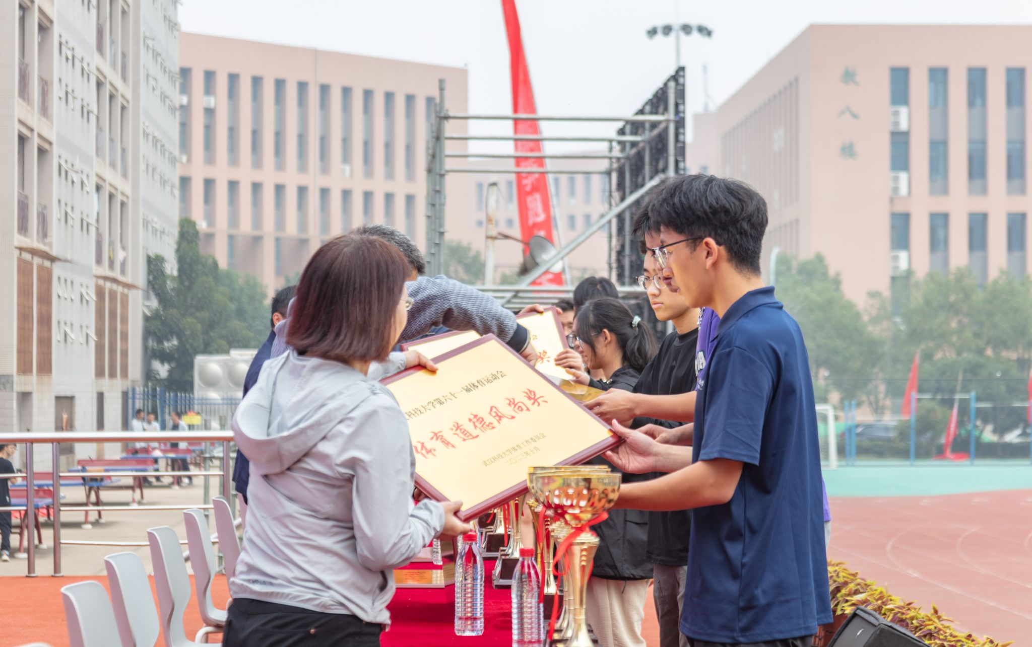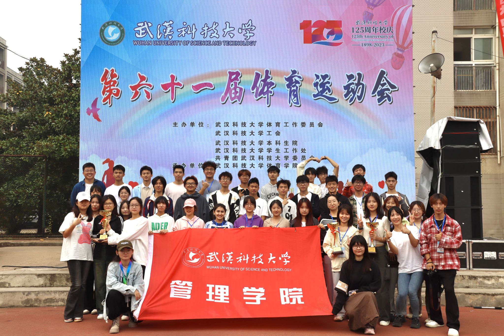 10月28号上午十一点,Beat365官网在南苑操场举行第六十一届体育运动会闭幕式。闭幕式上,第一项由运动会赛事主管敖德江宣布竞赛结果,第二项学生工作处处长许立桥老师宣布“体育道德风尚奖”评比结果,第三项体育学院副院长王路遥老师宣布“组织贡献奖”获奖单位,第四项党委宣传部常务副部长饶红亮老师宣布“最美人气方阵”,第五项为领奖仪式。颁奖结束后,老师团体以及学院方阵合影留念。(潘梦颖)